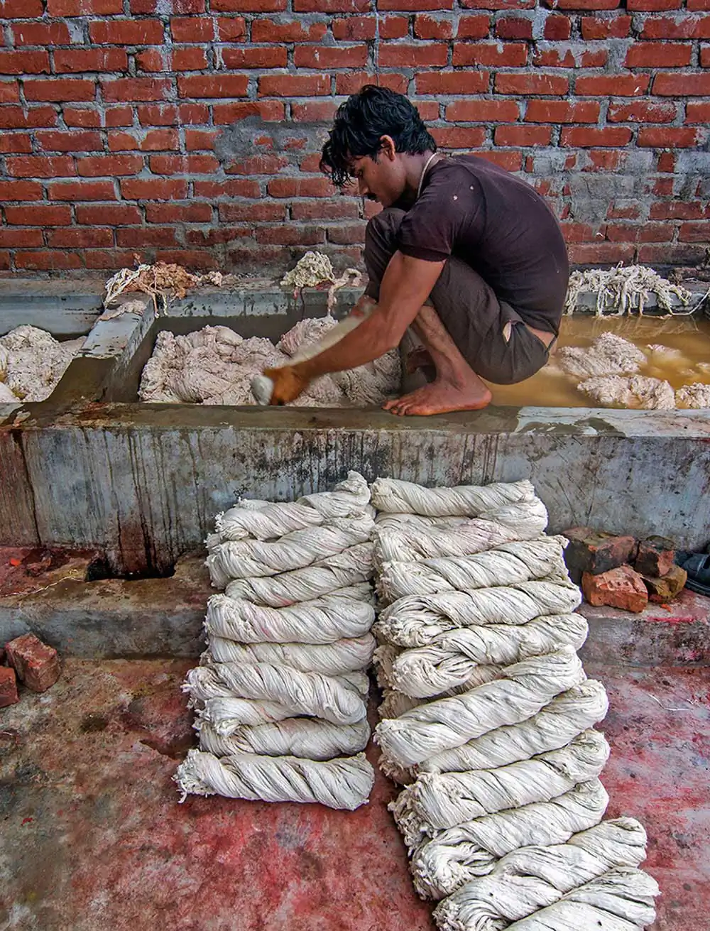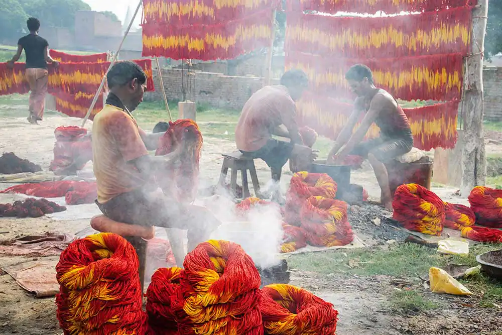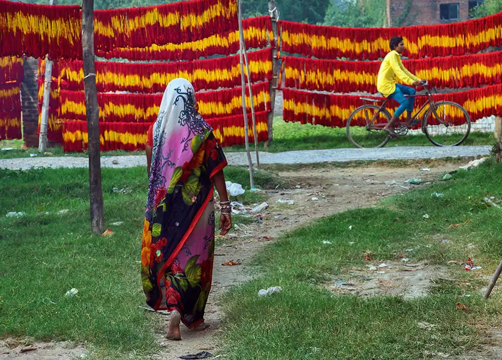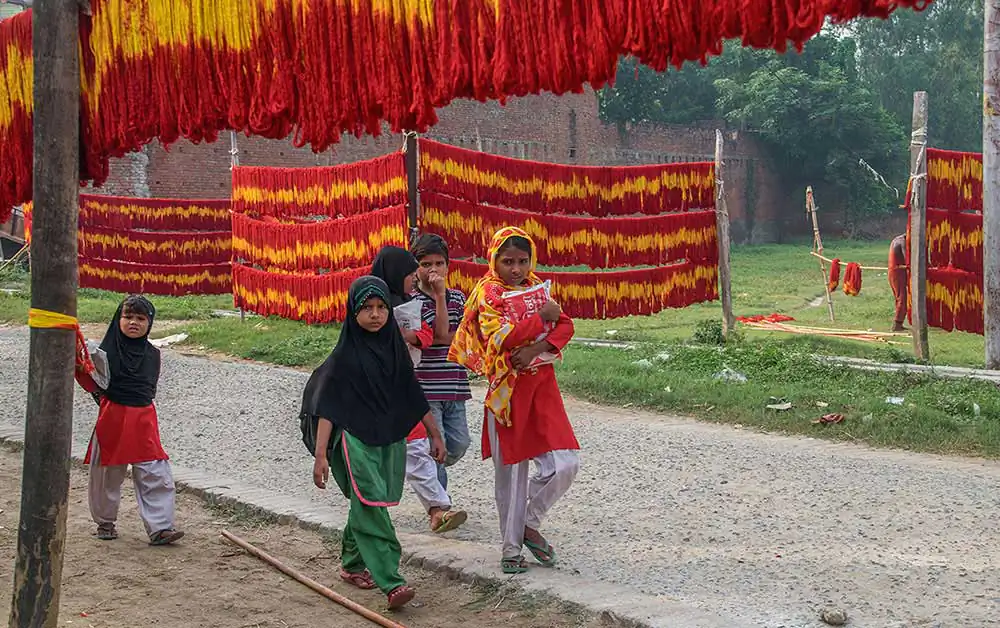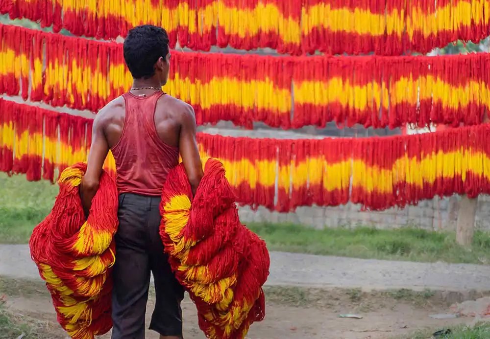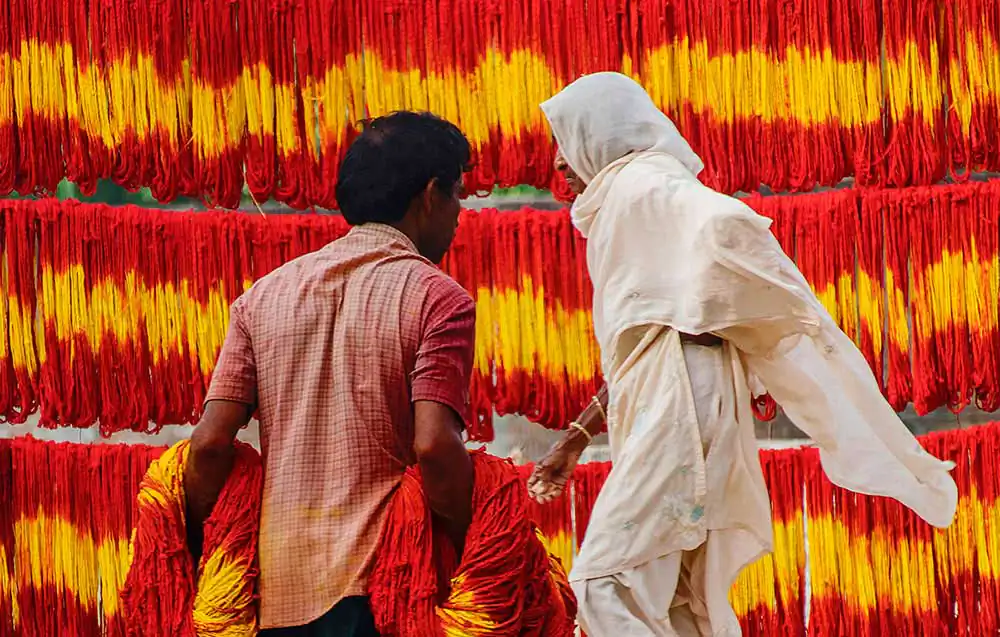 A visit to this village captivates one’s eyes with the red and yellow colours of these threads left for drying on clothes lines, along the roadside. One will find the Muslim artisans busy with their work while verses from the Quran are played on tape recorders. This series of images reflects not only the process of making kalava but also the blend of cultures.