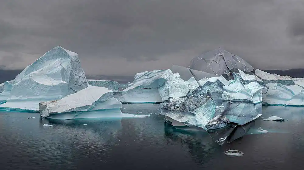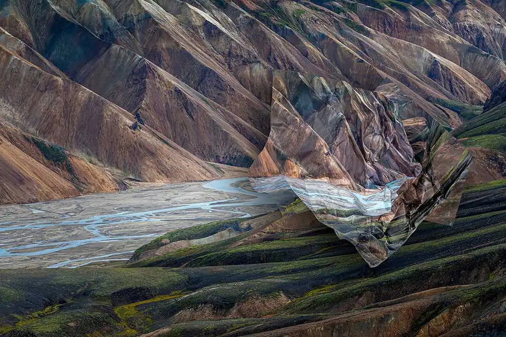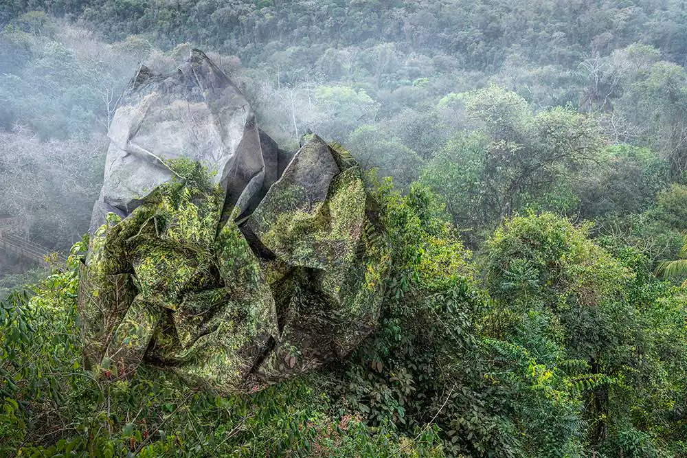 The artist brings a unique and original approach to the subject of the landscape. Through her lushly colored photographs of landscapes from different parts of the world—including Argentina, Greenland and Iceland—she comments upon the decline and deterioration of the environment; undertaken through a physical form of paper destruction—crumpled imagery laid atop the same photographic vista.