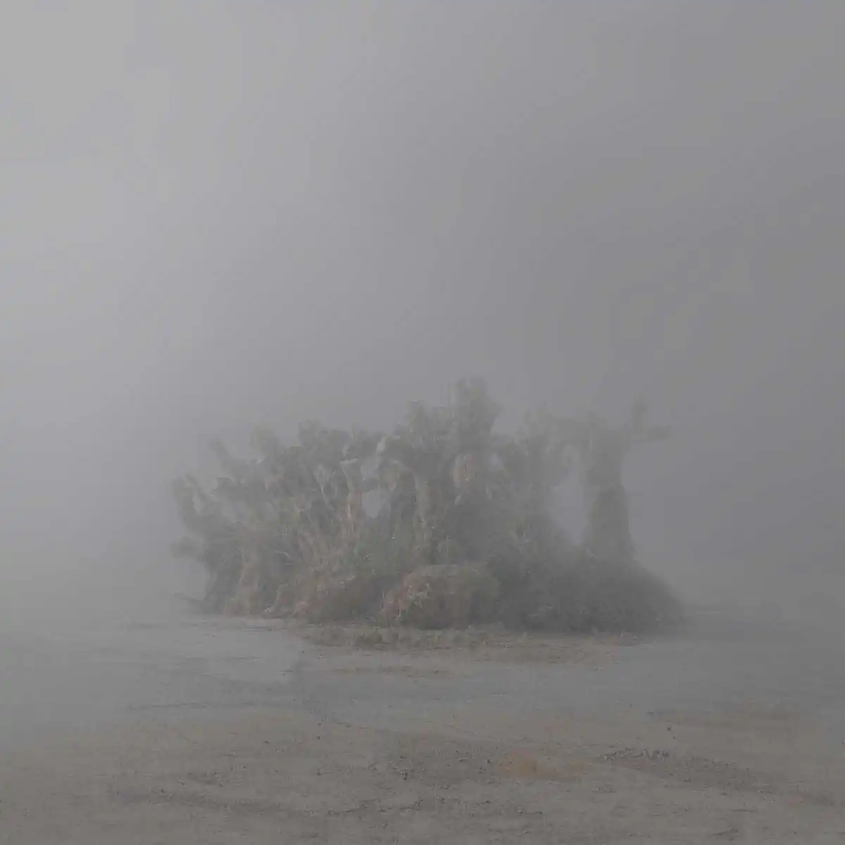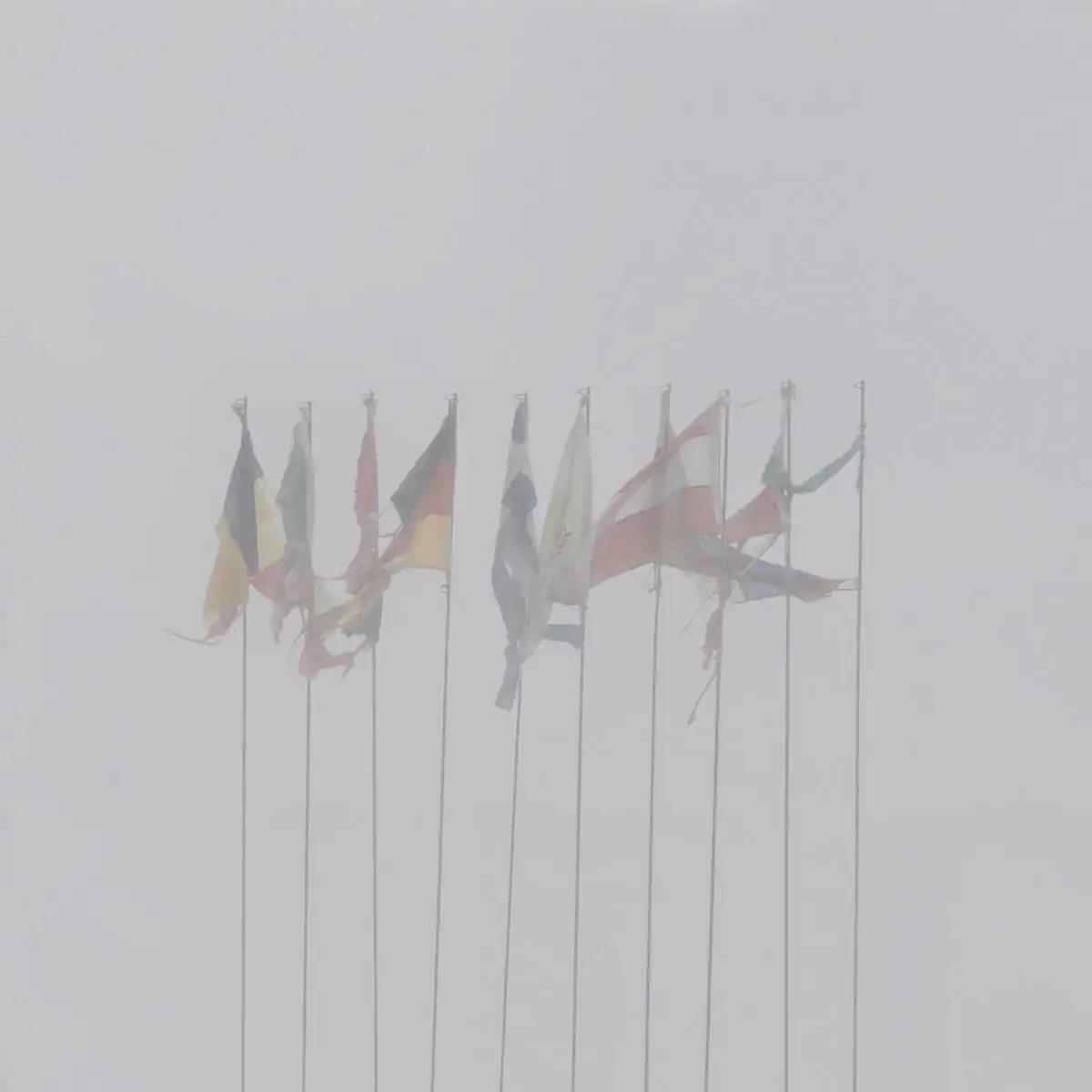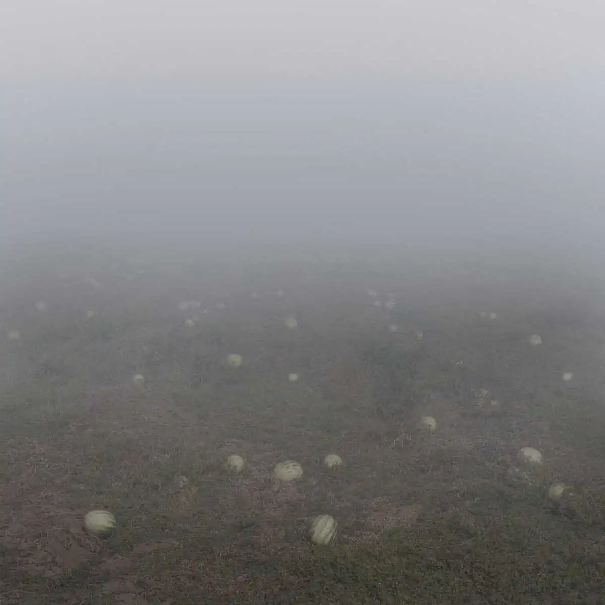 The horizon is hidden, preventing us to see what’s yet to come. Could this blurry atmosphere be smoke from a violent riot, the Sahara desert’s dust cloud or is it just morning fog? Empty highways, solar panel fields, constructions left unfinished, rotten watermelons and torn flags seem stuck in an intermediate state, portraying the current situation, like distorted symbols of a bygone era of growth. In this serene rural scenery, far away from the city’s battlefield, there is a subtle feeling of uncannyness.