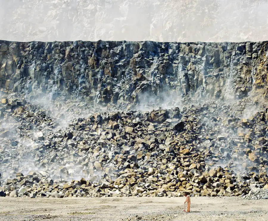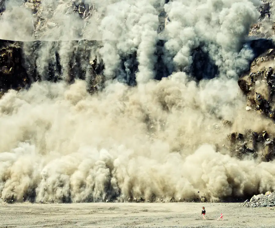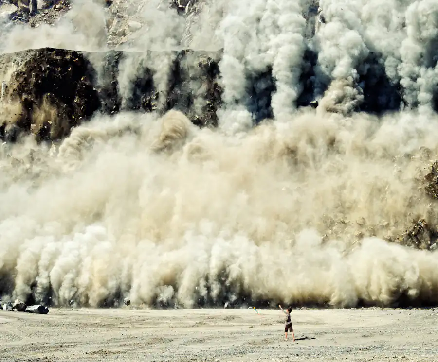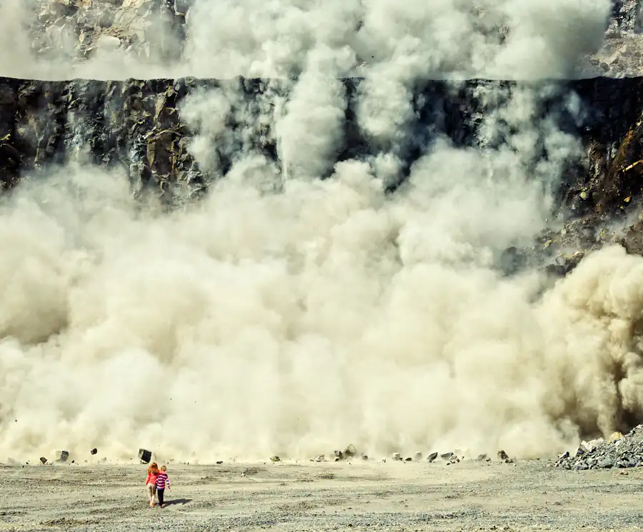One day this dream became real thanks to a new friend of mine working as mining engineer in one of the biggest basalt’s caves here in Sicily. I scheduled a day time in the main large area in front of the basalt wall to shoot some children and the “dust cleaner” of the final shot as in my original idea had to be the foregrounds of the photos and after a couple of weeks I came back to the cave at the same day time to capture in a sequence of images the wall explosion and collapsing After that I worked on the photomontage of the two steps of my project.