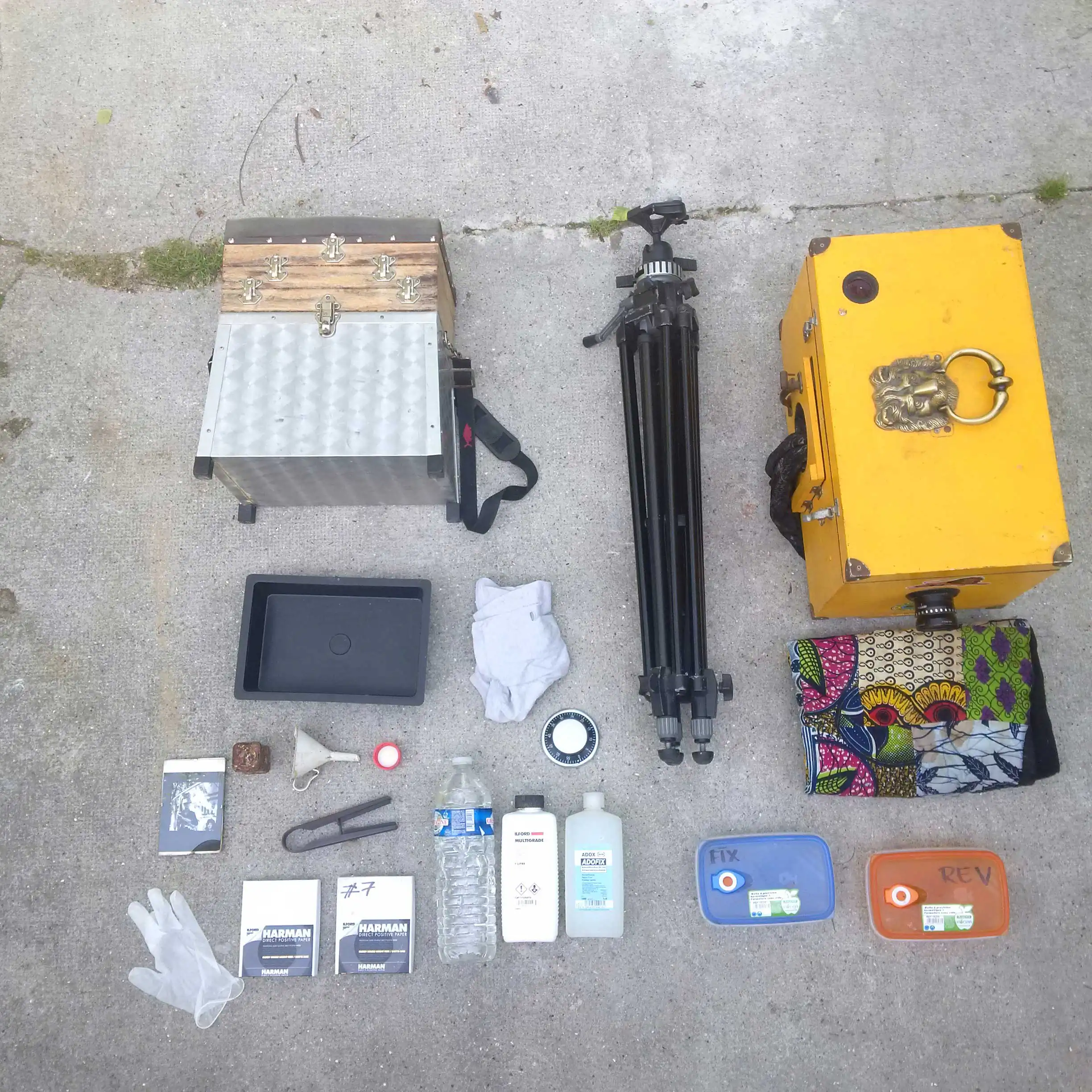 In photography, I’m working with two different tools, so let’s say I’ve two camera bags. In the first one, you can find an entry level reflex, which is a Nikon D5000 with two lenses (a 18-105 mm and a 50mm 1.8) and a Manfrotto Tripod. I also have a Lomographic camera called Holga, with a couple of b/w and color film. In the second “bag”, you will find an Afghan Box camera, which is a home made wooden camera with an included laboratory inside. It allows me to focus, shoot and develop a black and white picture in the same place in about 3 mn. Beside that I need to carry a studio tripod, some Harman direct positive paper, chemicals (revelator and fix), a timer, a fisherman chair (to carry everything inside) etc…