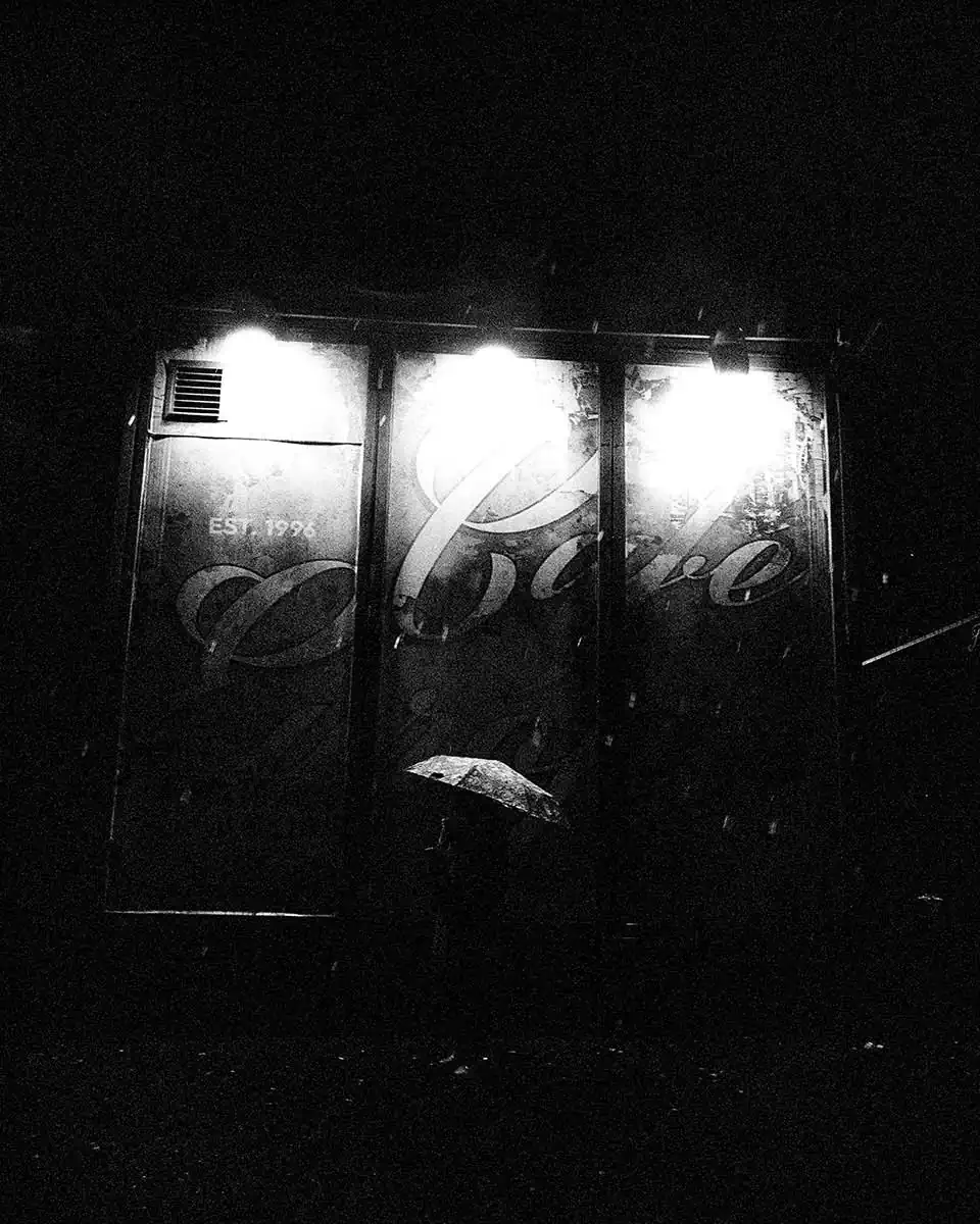 The weather was really miserable that day. Sleet, rain, and wind. But for me that is ideal for street photography. I love the way such weather makes my town, Tampere, Finland, look new and interesting. I had my favourite bad-weather set of equipment:  a Hasselblad Super Wide, that is fairly well protected from the elements and Ilford Delta 3200 film that I push all the way to 12500 ASA. This allows me to shoot without a tripod even in such dark conditions. I had noticed this particular spot already earlier. It is very graphical and strong. Then when I saw this lady approaching with an umbrella, I got ready to aim and shoot. She stopped in an ideal location just for a second, enough for this shot. So as always, I rely on preparation and luck combined.