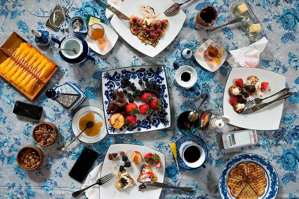These are authentic meals shared with family and friends, photographed at an inspired impromptu point in time. Considering the premise of my narrative, I certainly did not wish the photographs to be interpreted in any way as curated food images, and I’ve noticed people do connect with and think about them quite differently. After I photographed several pieces, people in my circle who knew about the project were aware of the potential we’d stop to capture the moment. Enthusiasm by guests and hosts alike motivated me further, and of course customarily having my equipment with me helps keep the potential available and fresh.