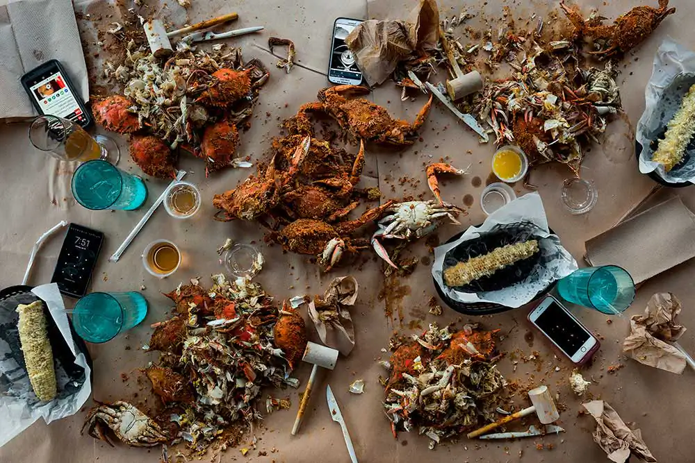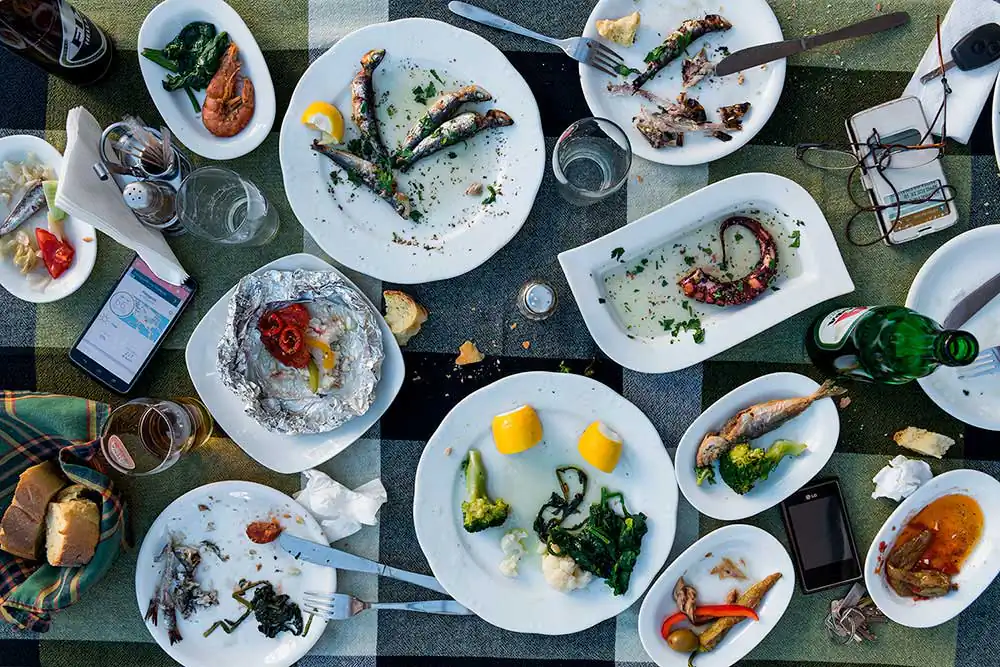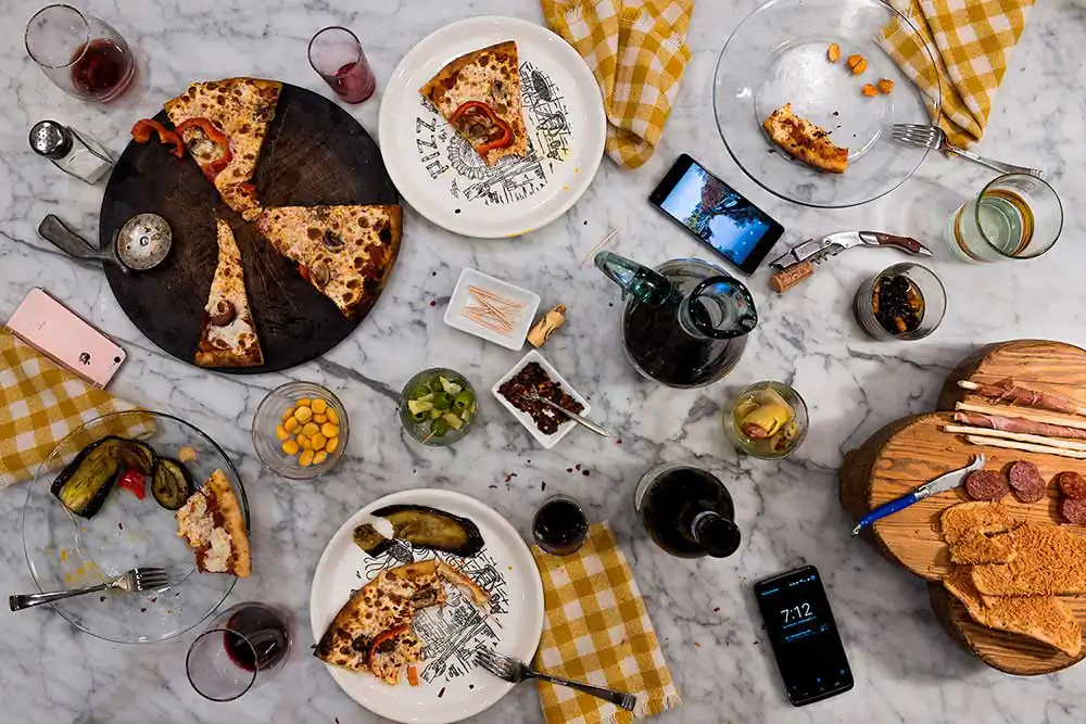 My setup comprises a raised tripod with my camera cantilevered and floating above the meal surface. A stool, chair, or ladder helped elevate me enough to properly compose and focus. As I’m selective about composition, I did make necessary minor adjustments of objects within the frame, including some occasional additions and omissions. Host and guest patience (and entertaining input) were always appreciated!