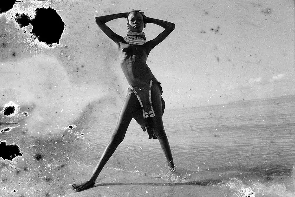 “… One day as I was walking along the shores of Lake Turkana in Southern Kenya, I came across a lovely nubile girl standing like a bronze statue in the heat haze on the waters edge … the vision stopped me in my tracks – she seamed quite stiff as she looked down into my lense – I couldn’t believe my luck – when our little seance was over, I took the film out of the camera and wearing only a brief bikini, stuffed it into my bra, because it was so hot, I dived into the water and remembered the film when it was too late – this image is the only one that survived …”