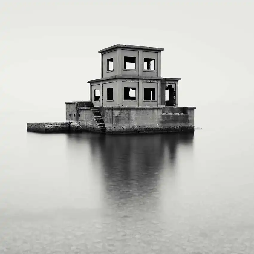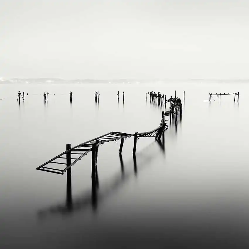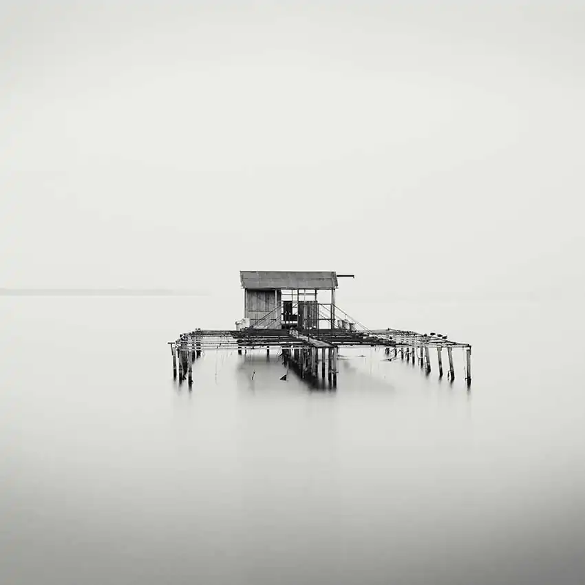 This work started on the shores of Lake Geneva as I arrived in this beautiful region in 1995. It wasn’t supposed to be a project at the beginning. I was just taking photos of this lake in every season year after year, and improving my techniques and experiences of black & white. When I discovered Asia in 1985, I was firstly attracted to the traditional Chinese paintings and the amazing landscapes they depict. I’ve read and learned intensively about this art of ink painting for many years. Gradually, it became an important source of inspiration which encouraged me to find some similarities between painting and black & white photography. For this Waterscapes and Beyond series I visited many other lakes in Europe and in Japan where I’ve been immediately fascinated by the remains of the fishing structures and some other constructions above the water. I took lots of photographs of these structures for many years and eventually decided to make a project out of them.