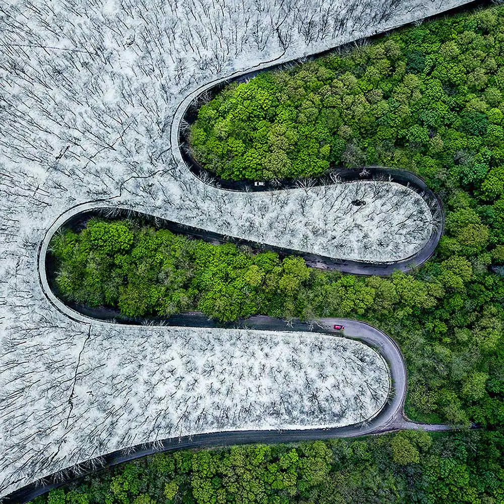 That particular photograph is composed of two images. The photographs were taken in Romania, Bihor County, in an area close to where I live, using a Mavic Pro drone. Actually, I took a series of photos in that spot, the first of which was taken during the summer of 2017. That’s when I first noticed the potential of the place, I loved the way that winding road, surrounded by acacia trees, looked from above. So, after seeing the result of that first picture, I made the decision to also take that exact same picture, but during the winter. In order to obtain a beautiful contrast, I had the idea of merging the two images. That is the only digital manipulation I did. The presence of the two cars in the final image was premeditated by me. I had to wait a few minutes in order to have a white car, respectively a red car in the photos. “Dead or Alive”, the photo on the cover of Dodho Magazine is the second version of my idea. The first one, “Weather Snake” is slightly different, but equally as popular. It has also obtained many awards, the most important being Winner in the abstract category of the 1st edition of Drone Awards, organized in Siena.