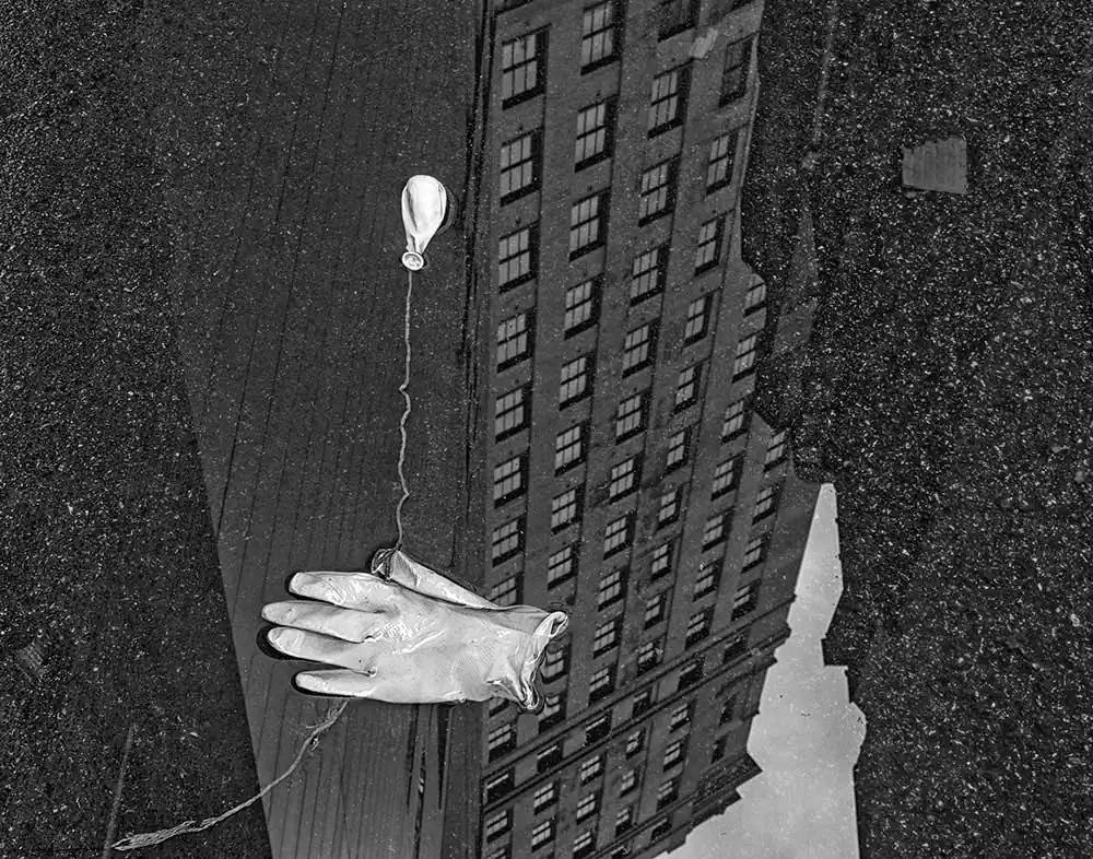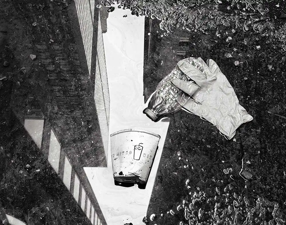 I think there are many sources of inspiration that lead to any particular series of photographs. In a previous project – “Chicago through the Looking Glass” – which was also published online in Dodho – I had been photographing architectural reflections in puddles, many of which were in the same service alleys that I used for “Discarded.” I knew there were discarded objects in these alleys, and I had seen and admired still-life photographs of rotting fruit and flowers. Somehow these things merged together in my imagination and I began placing found discarded objects in nearby puddles, using the reflections to provide a context for the objects. Pleased with the initial results, I soon arrived at the idea of arranging the objects to tell a story based on their usage. Since many discarded things are made of plastic, the ongoing societal debate about discarded plastics, and the damage they do to the environment, also came to mind as I developed the project.