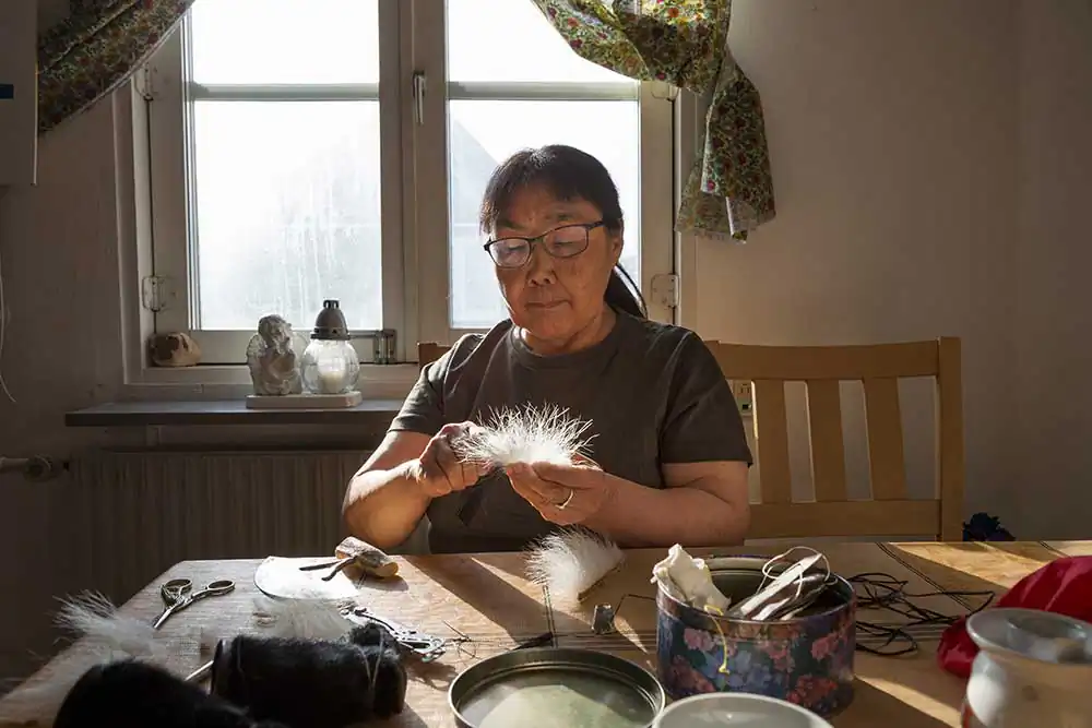 Siorapaluk, Groenland – Tukumeq is making small kamik shoes for newborns. She combs polar bear fur before sewing it onto the boots. Tukumeq is 64 years old, she is a teacher at the Siorapaluk school where three children study. She also organizes “a club” every week in the school with games and activities for residents. She is also an expert in sewing and cooking and helps her companion Peter hunt. Greenlandic women are experts in tanning hides and making clothes. Hunting is necessary in northern Greenland. The animals are wild and not farmed. The meat is used to feed men and dogs. The skin is used for clothing, shoes and to create tools like buoys or whips. Previously, seal skin was even used to make fishing lines and tendons for sewing threads!