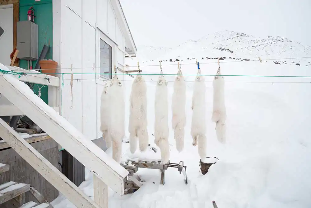 Siorapaluk, Groenland – Arctic fox pelts drying. Fur is used particularly on sealskin gloves or to wrap around the hood of an anorak