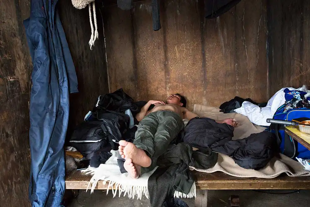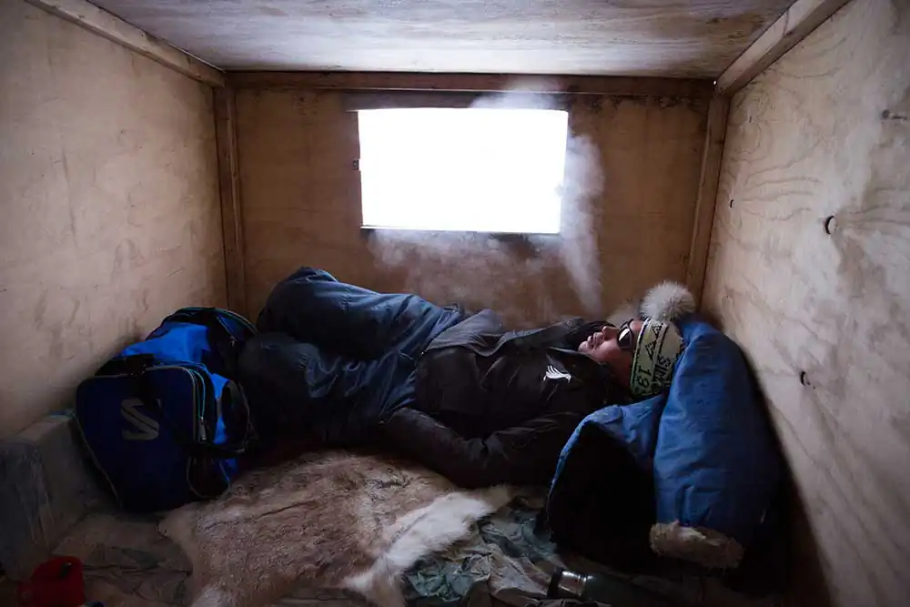 Qaanaaq, Groenland – Mikael is resting in the cabin. It is made only of wooden planks. You must bring sleeping bags, an oil fire and a rifle. The dogs are tied up outside the cabin. They warn if a bear attacks. These cabins are the property of certain residents but they are for everyone. In Greenland sharing is important