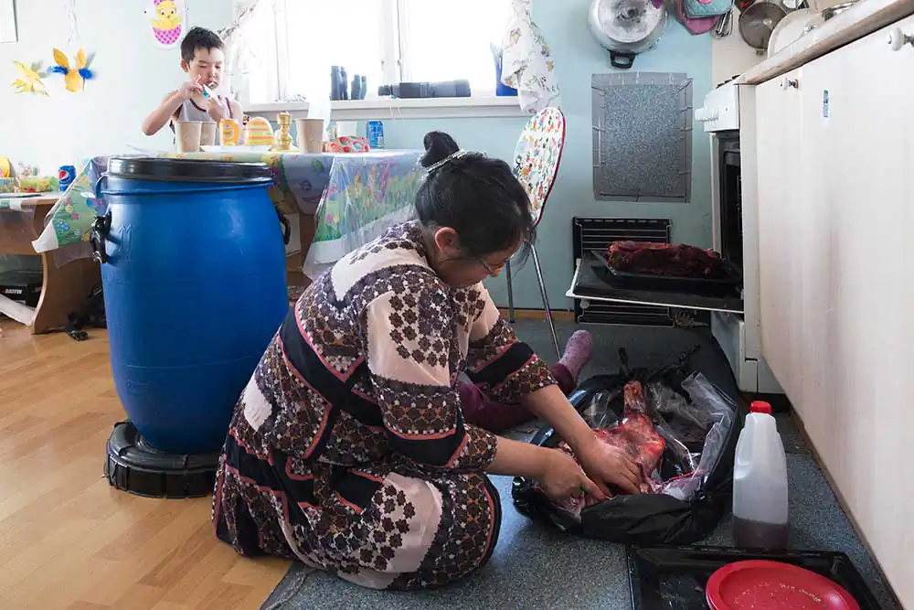 Qeqertat, Groenland – Bebiane cuts reindeer meat for the occasion while her son Rune eats the sweets and chocolates offered!