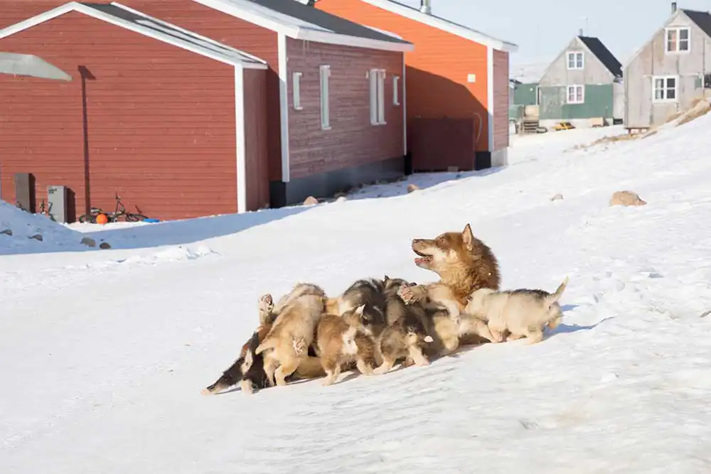 Qaanaaq, Groenland – Our dog is courageously nursing her eight puppies. Pregnant dogs are placed next to the owners’ houses in order to protect the puppies and to be able to feed them through the window. The dogs are placed on the ice floe in winter. In summer they reach the outskirts of the city when the ice melts.