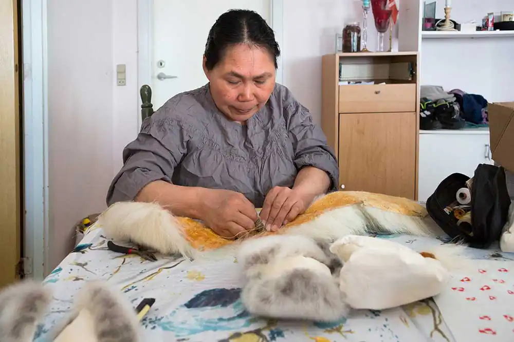Qaanaaq, Groenland – Inge sew of polar bear fur on sealskin gloves. The fur is sewn at the cuffs to tighten the neckline so that no air rushes in.