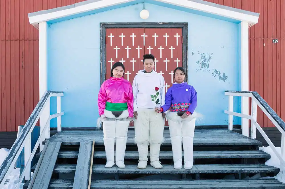 Qaanaaq, Groenland – The confirmands pose for photos in front of the Qaanaaq church. Johanne Kristiansen, Ava Petersen and Hansigne Qujaukitsoq. Confirmation is said apersortippoq
