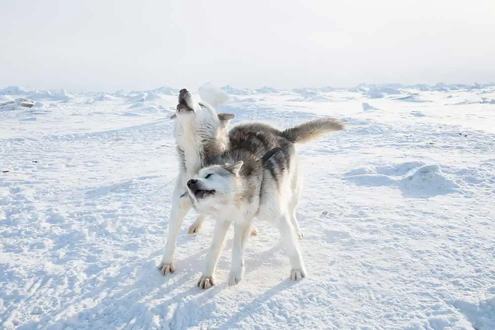 Qaanaaq, Groenland – Two dogs howl.