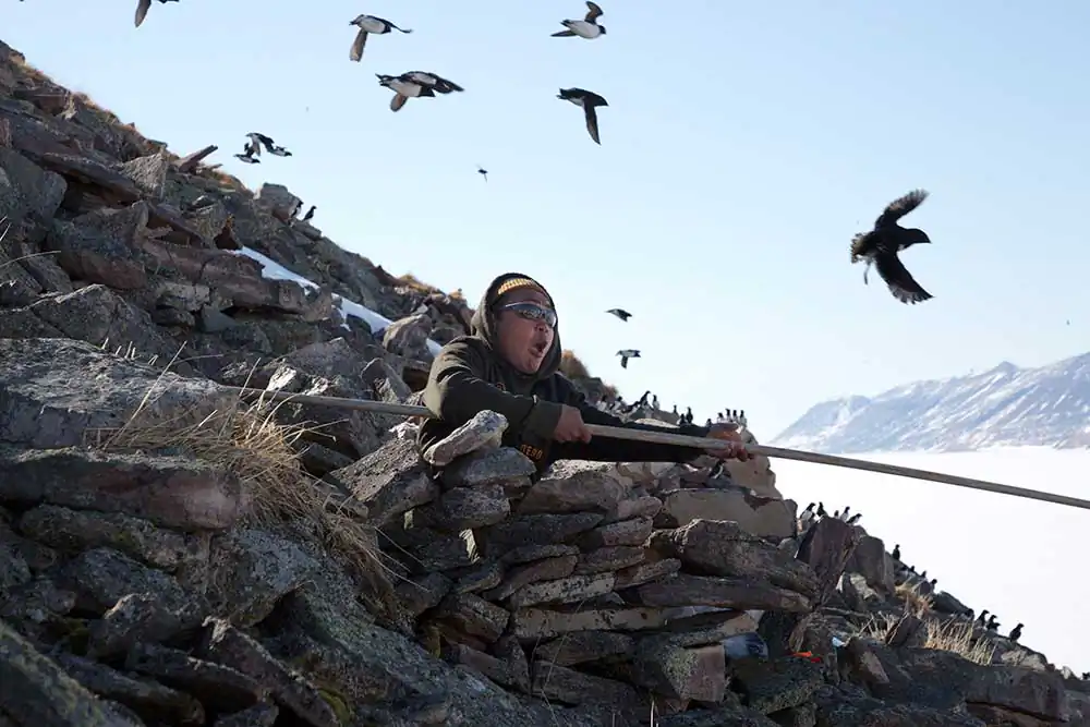 Siorapaluk, Groenland – Mikael surprised while hunting for appaliarsuit. Sometimes birds suddenly appear above us. You have to be reactive with the landing net. The flights of auks resemble the murmurations of starlings