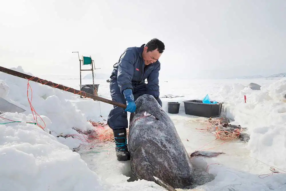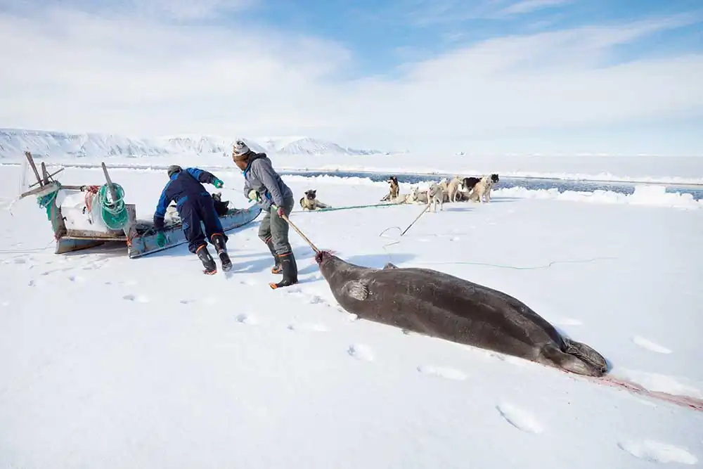 Qaanaaq, Groenland – The seal is pulled to the sled to be cut up. This is a bearded seal. Their characteristic is to have a mustache and to be very corpulent.