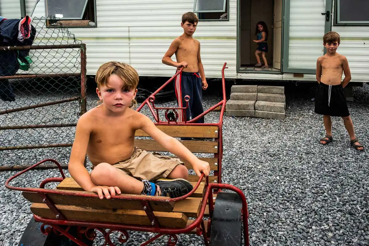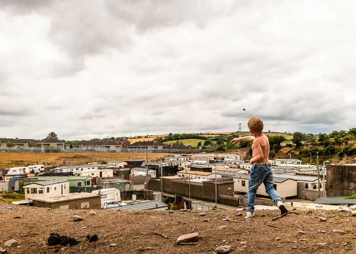 The Travellers had traveled and camped on the roadside, seldom remaining in one place for more than a couple of weeks, presumably because of the limited demand for work at any one place. But they began to suffer in the 1970s as the demand for their work decreased significantly. A movement emerged to settle travelling families on “halting sites” where they would have basic services and the children could go to school. This change in lifestyles did not come easy, particularly for the men who found themselves with very little to do as the unemployment rate is fairly high in the Travellers community (the suicide rate in the Traveller’s community is said to be seven times higher than in the population in general.) Although there are still approximately 30,000 living in Ireland they are clearly at the bottom of Ireland’s social and economic ladder. Nevertheless, this photo essay shows that the young Travellers still identify with their culture even though they now live in an environment made of concrete slabs.
