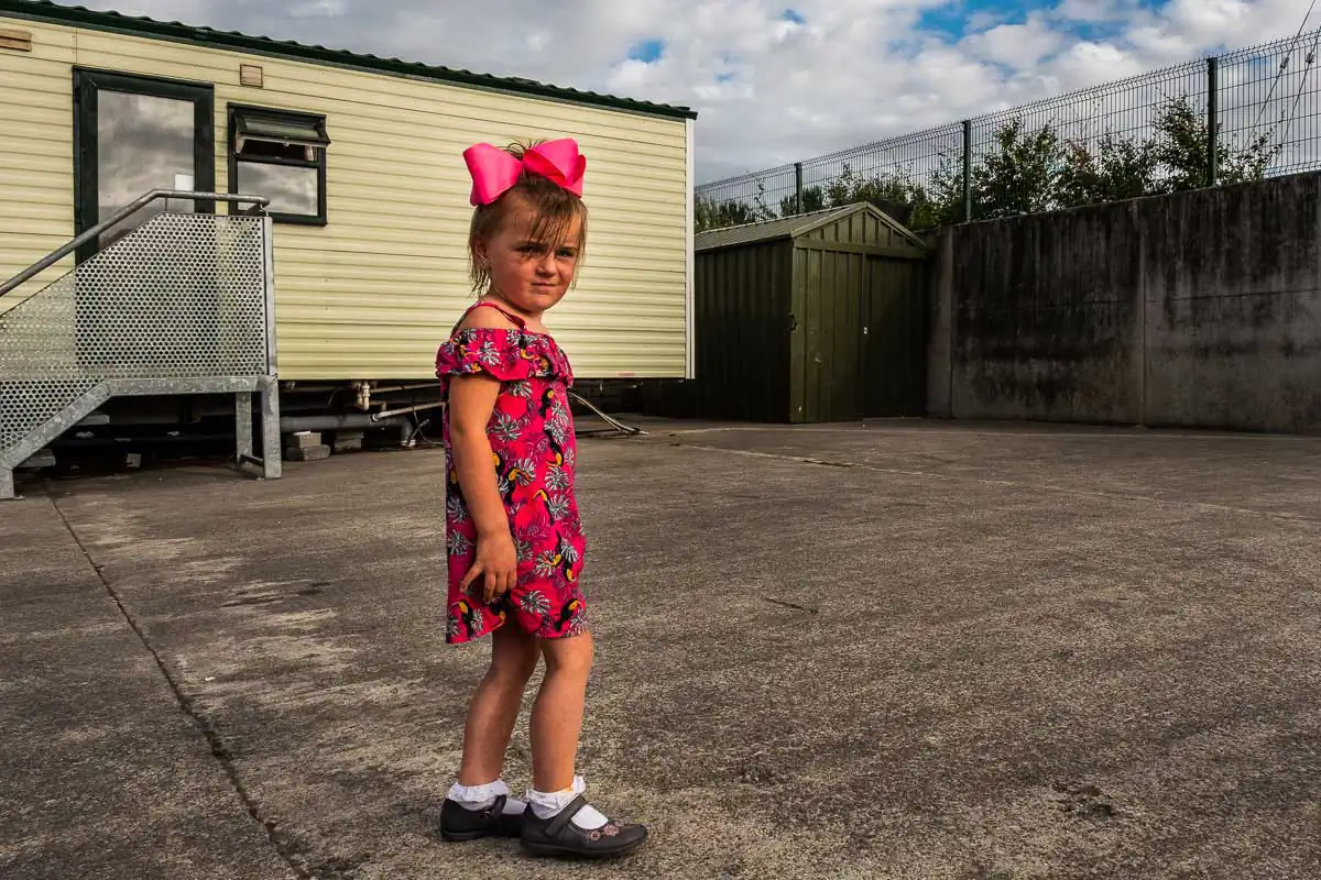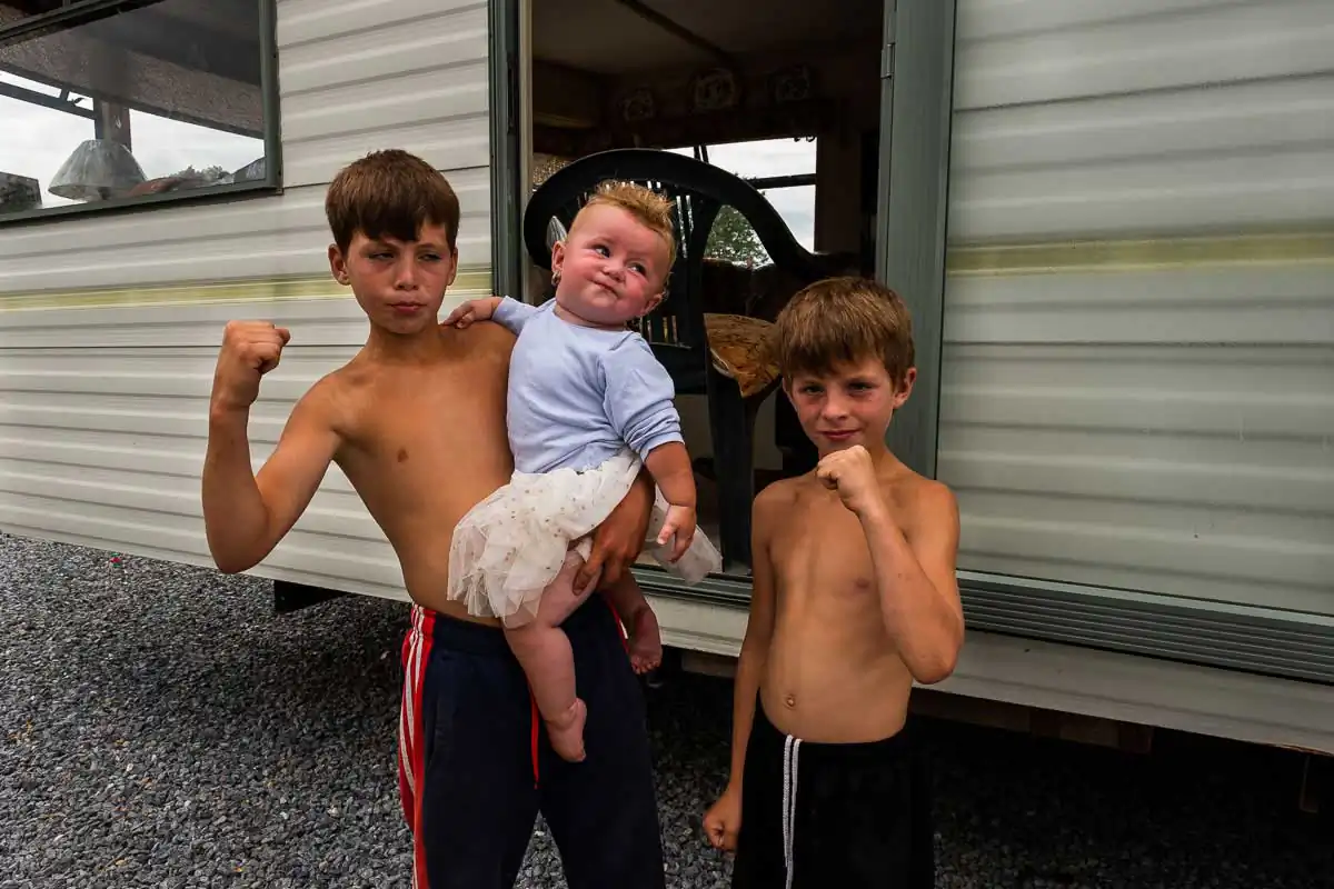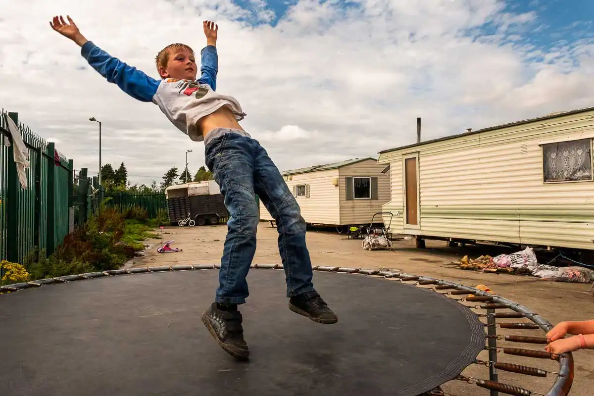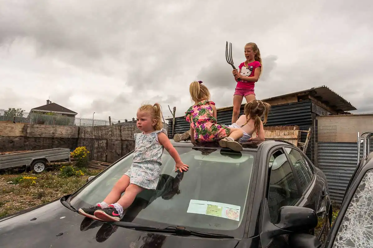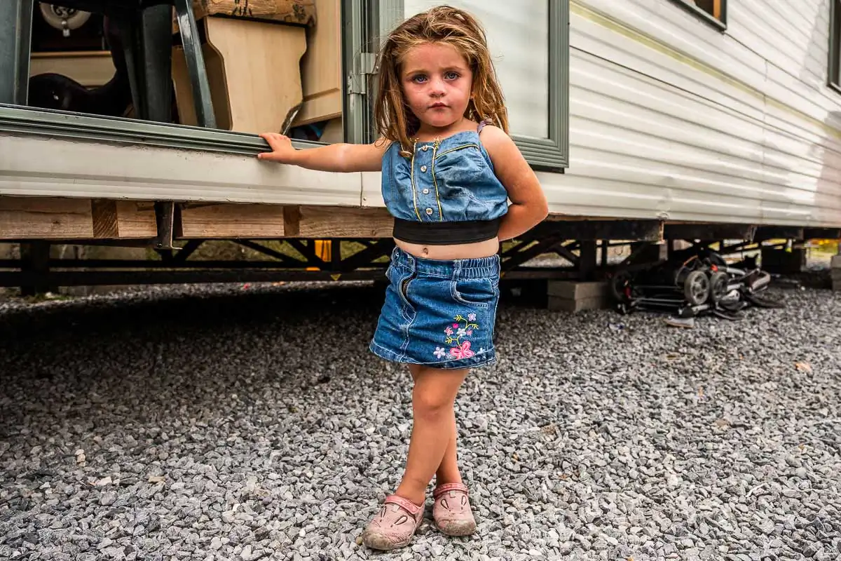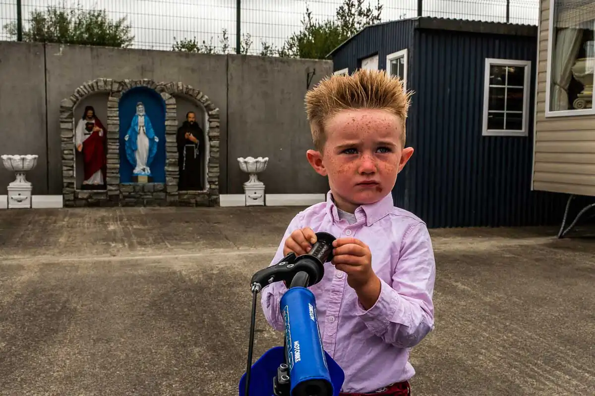 The Travellers are religious and large families are the norms. Gender roles are clearly defined even for the youngest of children. When being photographed, the young boys always show their tight fists and take a fighting position. Boxing is their favorite sport, punching bags and trampoline available on most halting sites. The girls, on the other hand, quickly take a provocative pose, putting their hands on their hips and pouting their lips. Most of the girls have long hair, and wear jewelry and make-up starting at a very young age.