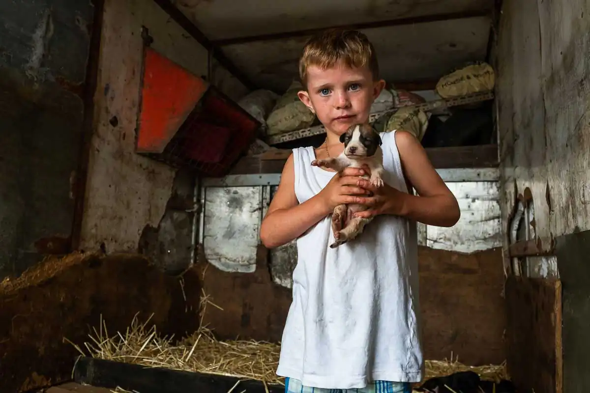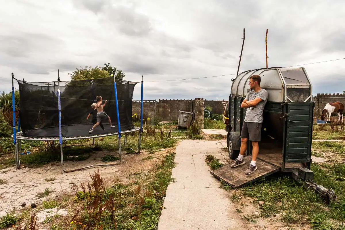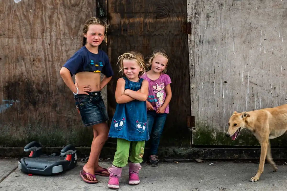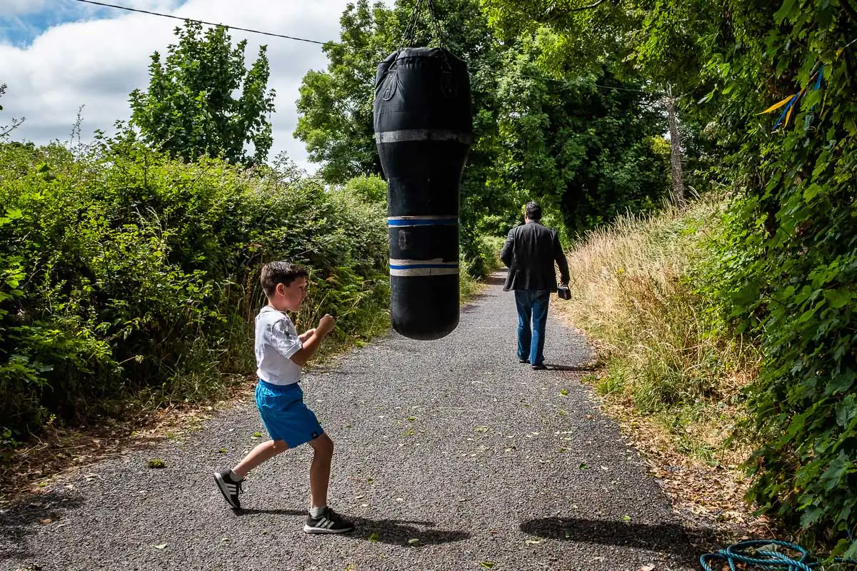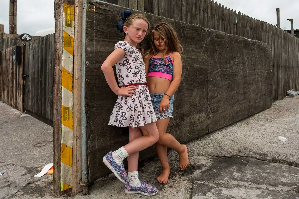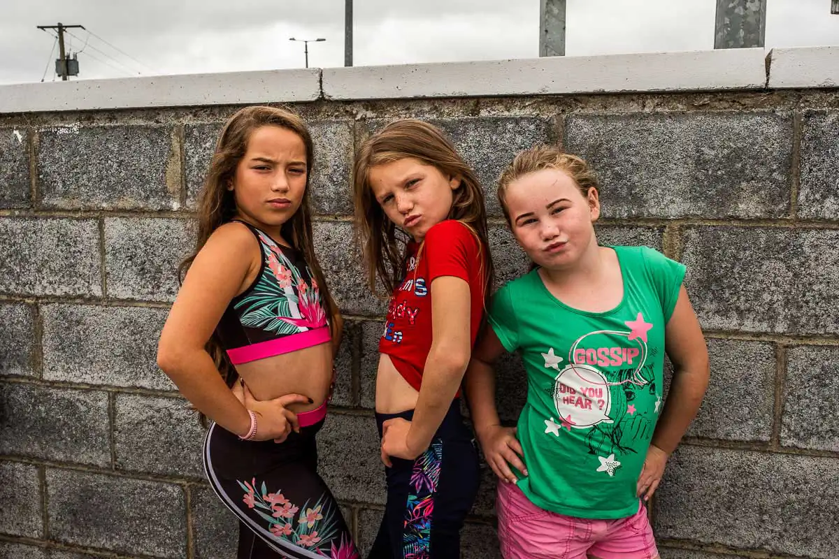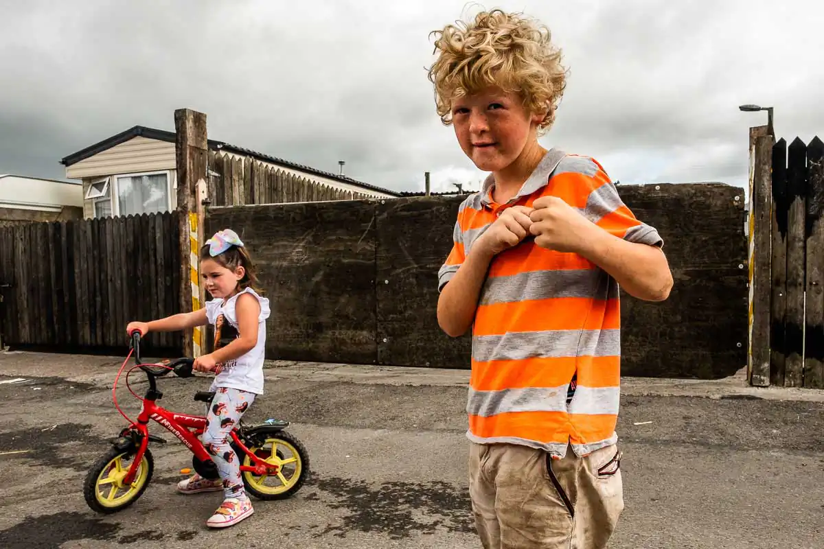 The Travellers are religious and large families are the norms. Gender roles are clearly defined even for the youngest of children. When being photographed, the young boys always show their tight fists and take a fighting position. Boxing is their favorite sport, punching bags and trampoline available on most halting sites. The girls, on the other hand, quickly take a provocative pose, putting their hands on their hips and pouting their lips. Most of the girls have long hair, and wear jewelry and make-up starting at a very young age.