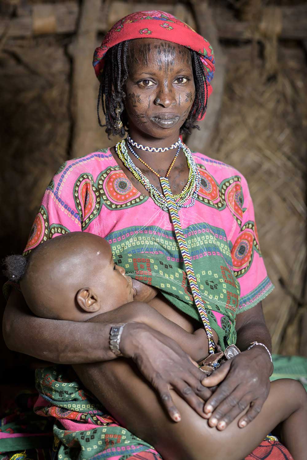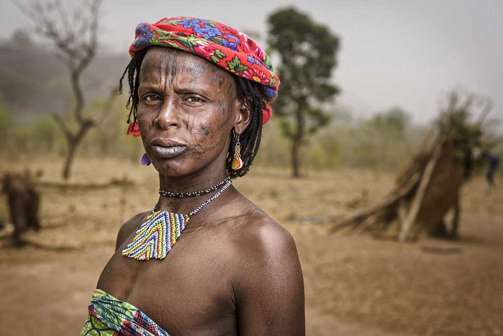 Portrait of a Mbororo woman with scars on her face and decorative necklace outside her hut.Portrait of a Mbororo woman with the typical scarification on her face holding her child inside a hut.Portrait of a Mbororo woman with scars on her face dressed in a very colourful outfit.Portrait of a muslim man with turban and hands held together.Portrait of a Bagdeli pigmy with a machete and net hunting with his dog in the jungle.Portrait of a camel herder looking strait to the camera.Portrait of a woman from the San tribe in a remote part of the Kalahari desert.Portrait of a beautiful himba woman sitting on the ground.Group of Himba women dancing during the day.Portrait of a woman from the Holi tribe carrying a load of clothes on her head. She is carrying the load to the nearby stream to wash the clothes. In Africa many things are still carried on the heads since not everyone has a motorbike or any other means of transportation. Holi are a tribe from South East Benin who used to adorn their bodies with scarifications, especially on their bellies. Nowadays this tradition is fading, being mostly middle aged women the only ones who preserve it.For the Yom tribe, the circumcision ceremony is a very important rite of passage from boys to men. A man circumcised in a traditional ceremony shows his penis wrapped in a banana leaf while he rests on a blanket under the shade.