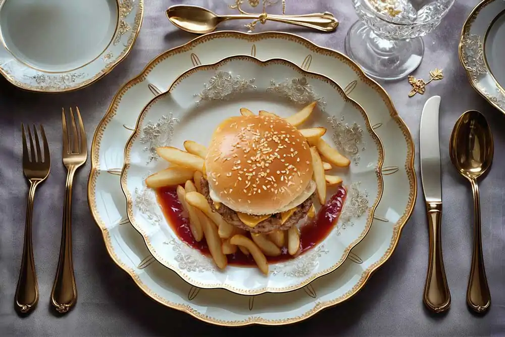 Junk Food Gourmet has been conceived with this “background sea” and its purpose is to denounce the harassment to which we are subjected by food multinationals that encourage us to take their products as the solution to our needs (not only food). I do it in an ironic, indirect way, presenting junk food as the main course of a haute cuisine menu served in luxurious restaurants or aristocratic houses. I wanted to align the status that junk food has in our society with the concept of haute cuisine that used to be associated with specially prepared dishes, elegantly presented and to be savored with space and attention to detail in taste, sight and smell. It is the degradation of haute cuisine and the exaltation of junk food that find a balance in the visual representation of my images.