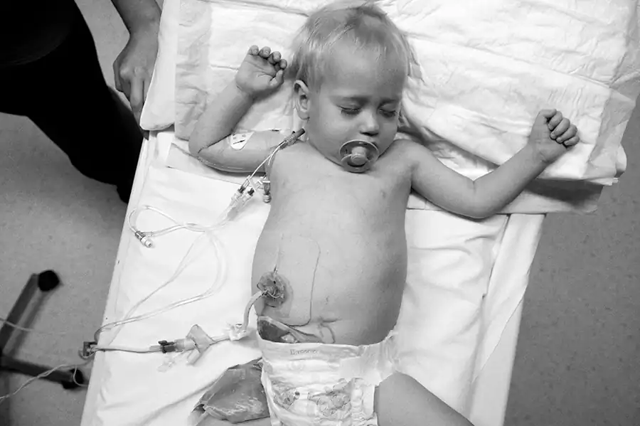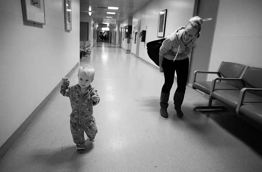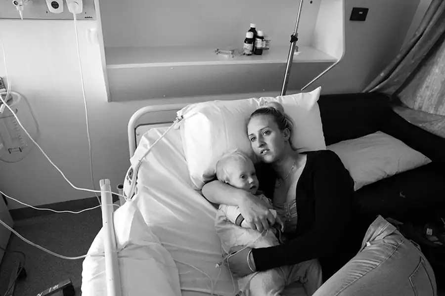 Having a seriously ill child is most parents worst nightmare but for Katie it is compounded by her being a young single mother. Her parents live over an hour out of Melbourne so Katie has been forced to move into commission housing close to the hospital so Jaylen can have access to the care he needs. Over the past two and a half years I have been privileged to photograph Katie and Jaylen as they navigate through an uncertain future.  His longest time spent at home has been 8 months, currently  at the time of writing he has been hospitalised for 3 months and is awaiting his 19th surgery. He is connected to a machine that feeds him directly into his stomach for 17 hours a day, and receives a speciality nutrition compound that bypasses his digestive system by being connected to a line that enters into his vein. Katie cannot work or study, her days are filled with appointments and the administration of Jaylen’s medical care.