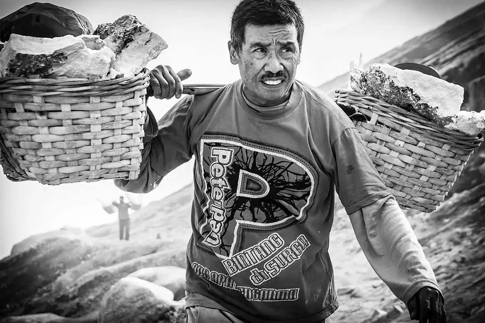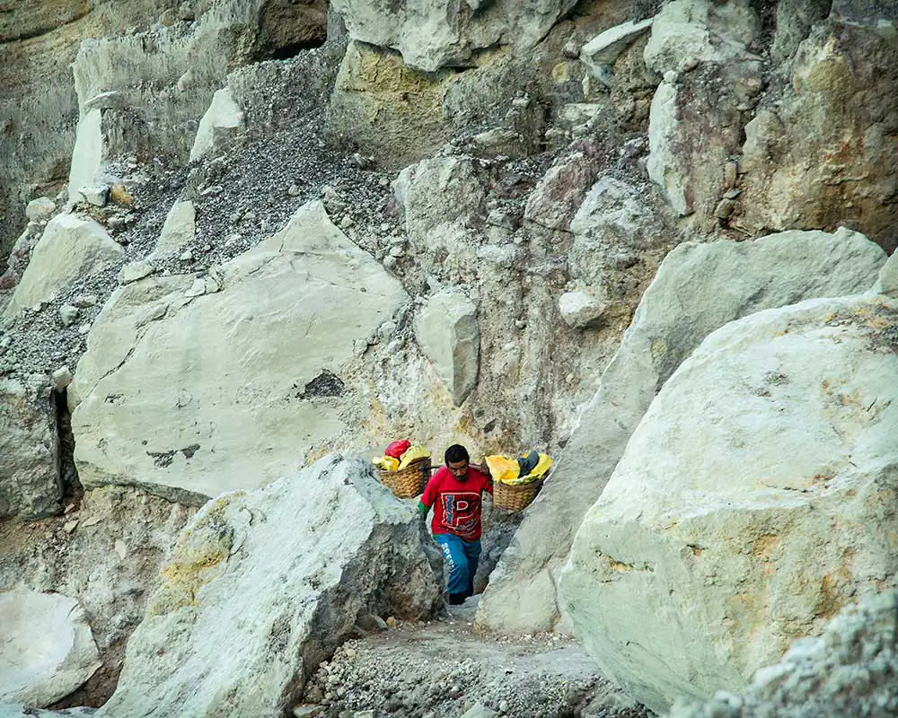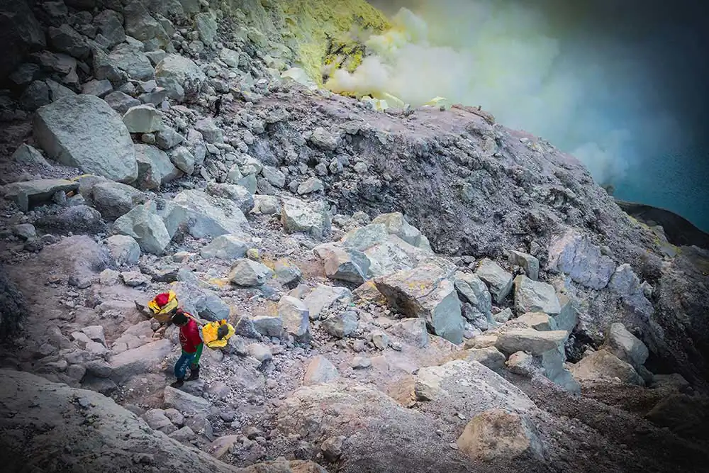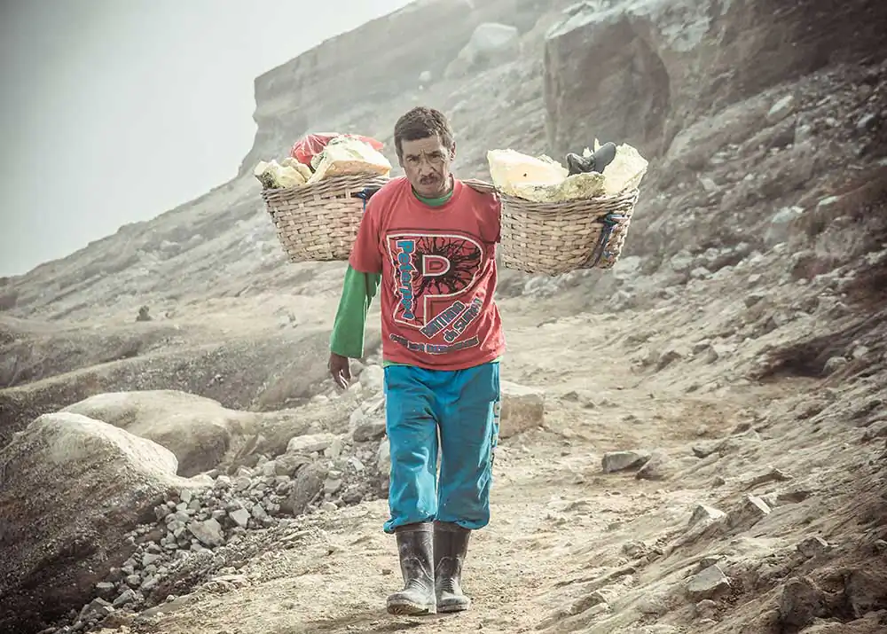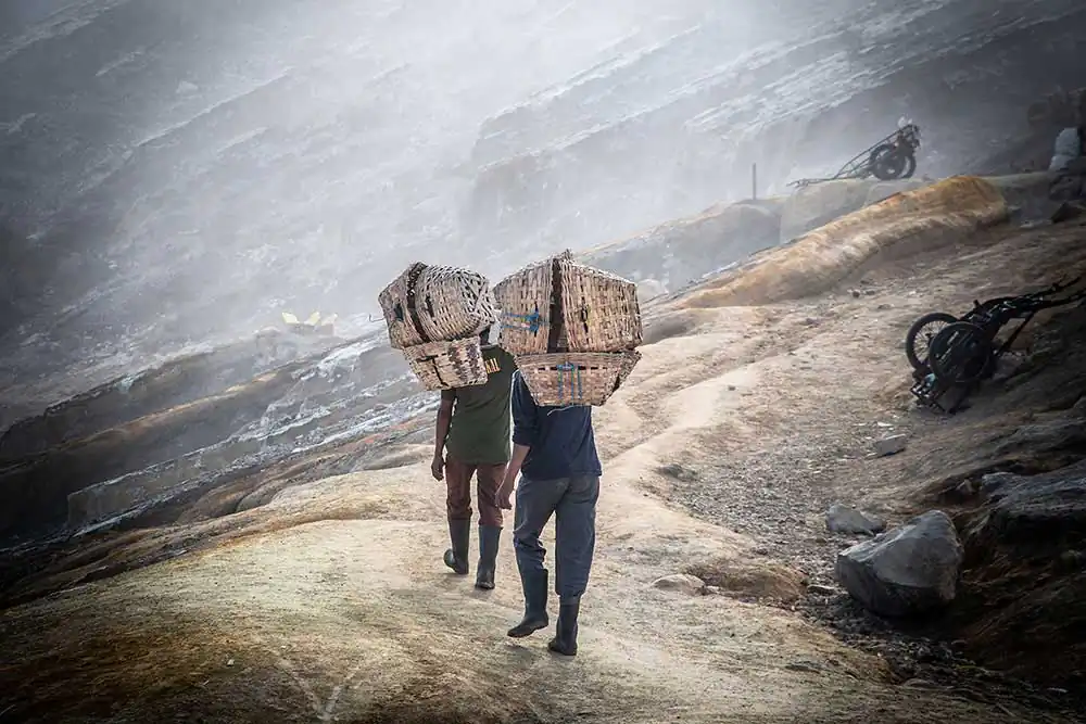 They carry about 70 kilograms of sulfur for several km between toxic fumes and very hard climbs. All for around 6/7 dollars a day. this is the price with which the sulfur, once extracted, is bought by an Indonesian cosmetics company.