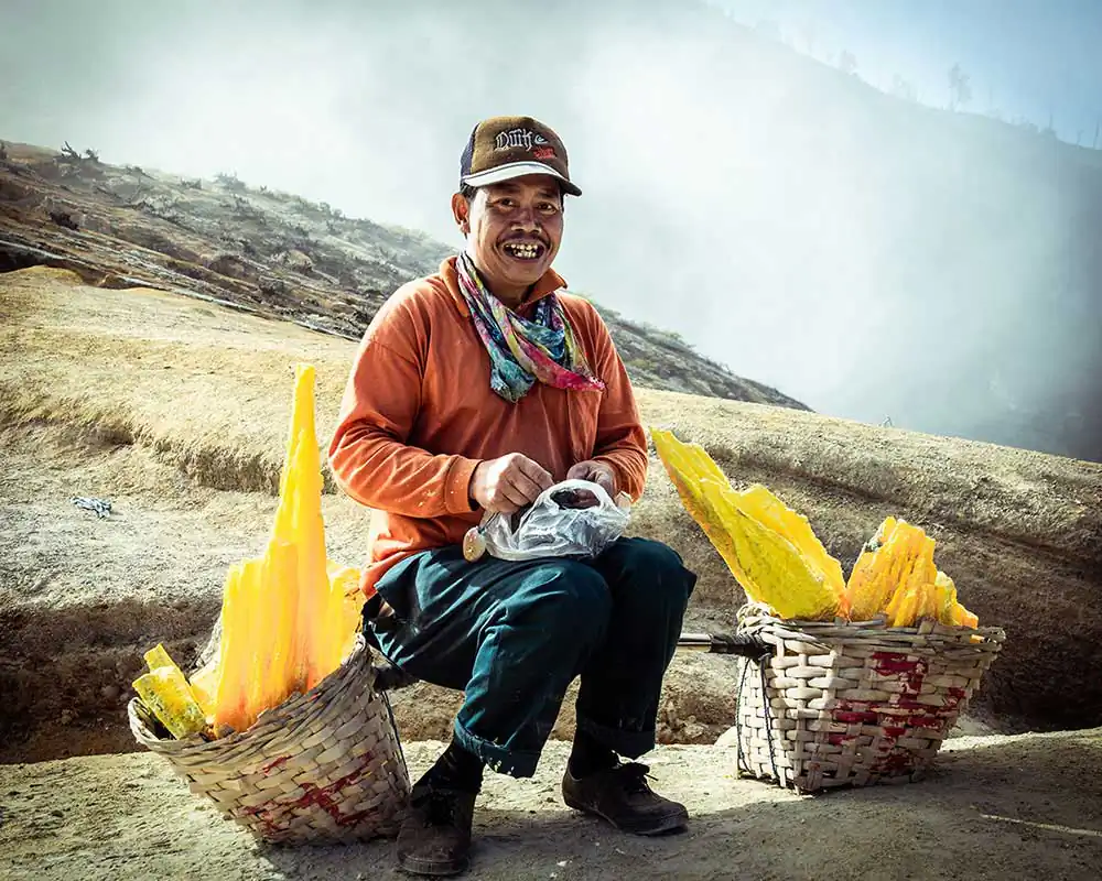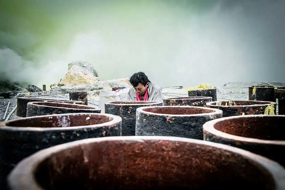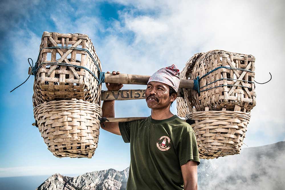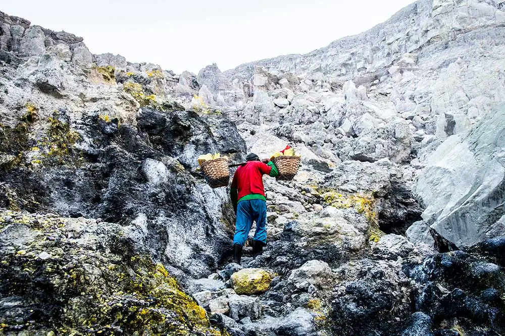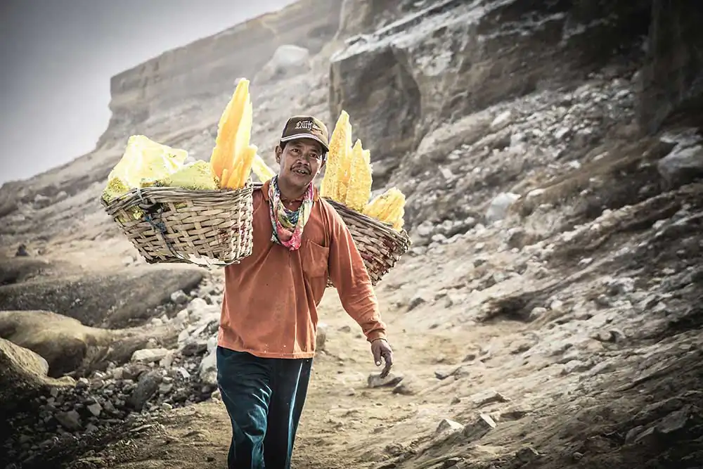 They carry about 70 kilograms of sulfur for several km between toxic fumes and very hard climbs. All for around 6/7 dollars a day. this is the price with which the sulfur, once extracted, is bought by an Indonesian cosmetics company.