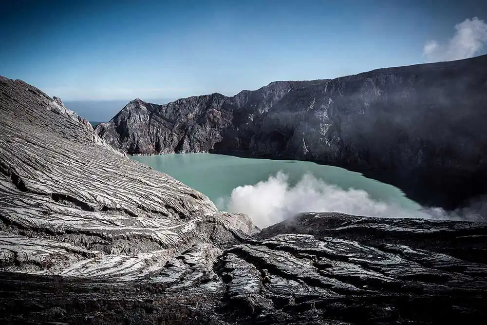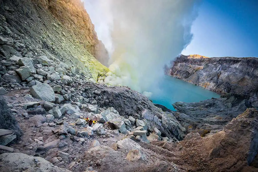 The Ijen volcano complex is a group of composite volcanoes in the East Java, Indonesia; in the crater of this active volcano there is a famous sulfur mine and here, for about 40 years, about 400 miners are lowered into toxic fumes and extract the element from the sheets of the volcanic walls.