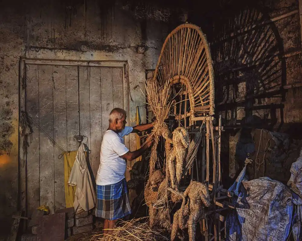 Most of the artisans are Bengali origin or work in a cluster of workshops owned by Bengali craftsmen. About 150-200 families of artisans live in this area. This has been their traditional occupation. The workshops are dimly lit. For last to month I have documented the workshop of Naryan Chandra Pal, one of the elderly artisans of Kumartuli. The whole process of Idol making is documented over the period of two month. The wooden frames on which the idols will be cast are wrapped with specially cut straw.