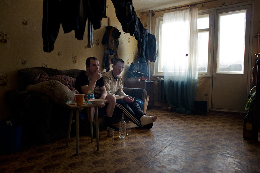 The main ingredient is the desomorphine, an opiate that is obtained through the synthesis of codeine. The process consists in ‘cooking’ codeine with the other chemicals till the substance is reduced to a condensed dark brown paste. There’s something hypnotic about the rituality of the process. The smell of sulfur is extremely pungent, and it permeates everything around the small kitchens where Krokodil users hide from the external world. Those who use it shut themselves up in the house and engage themselves in a continuous cycle of preparation and getting high, with an effect that lasts about 40 minutes each time. They spend days indoor, in an alternation of moments of unconsciousness and sporadical lucidity. Krokodil addicts rarely manage to maintain a regular social life. Most do not have a permanent job, at most they do odd jobs to buy the next dose of codeine.