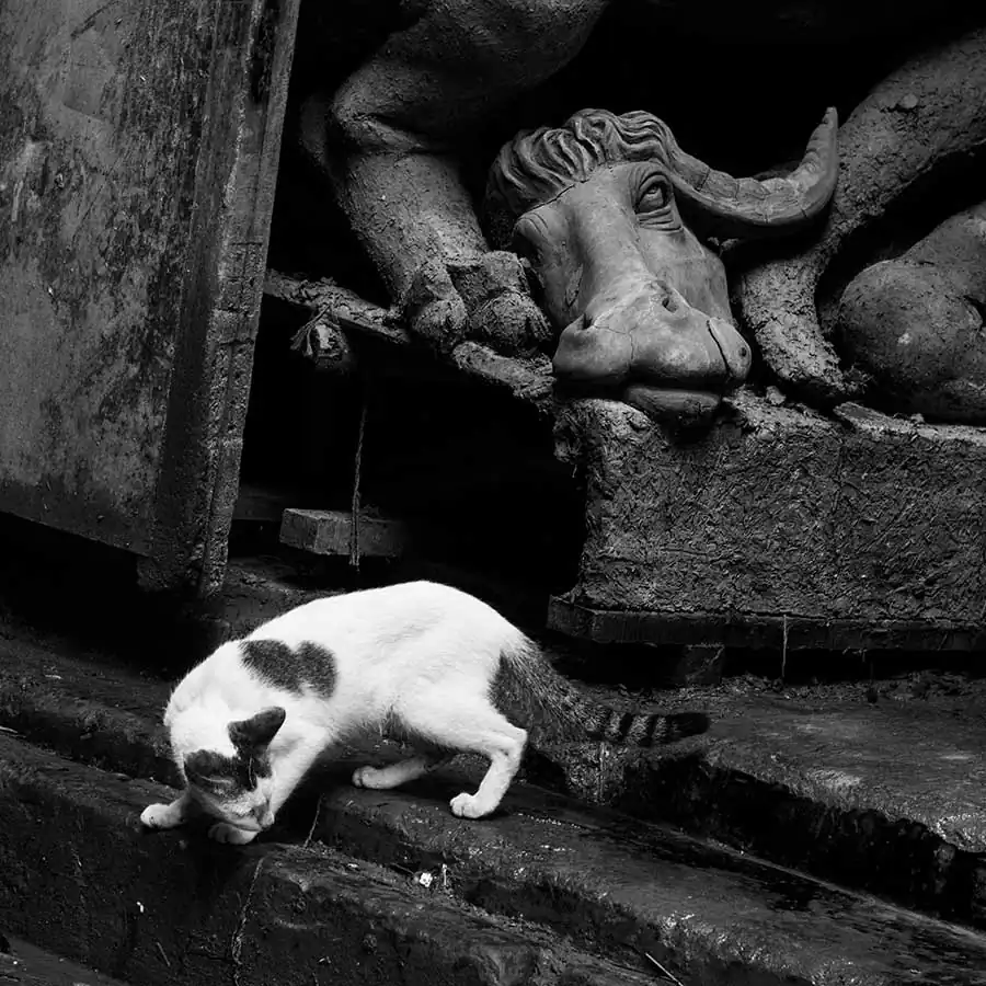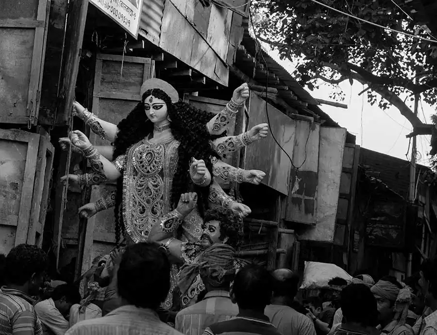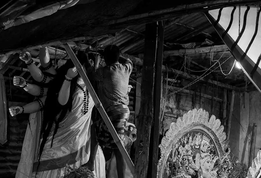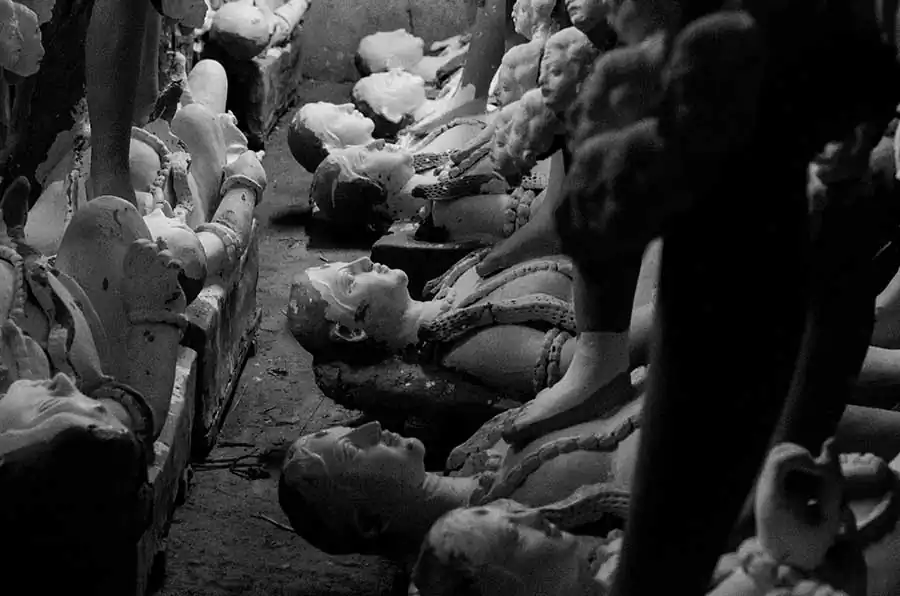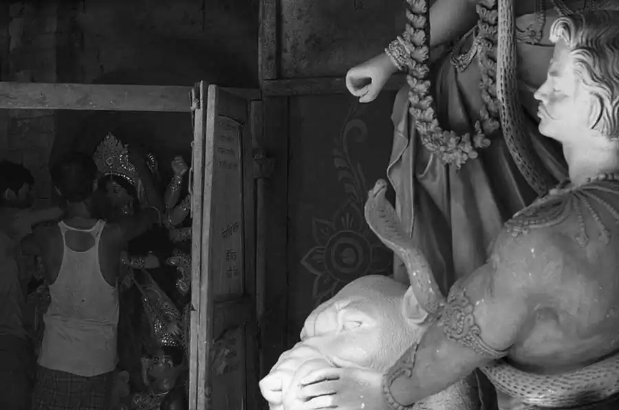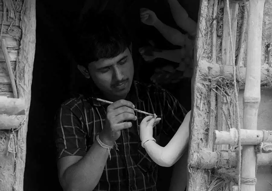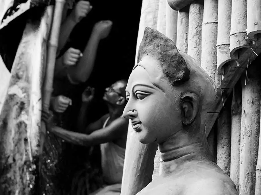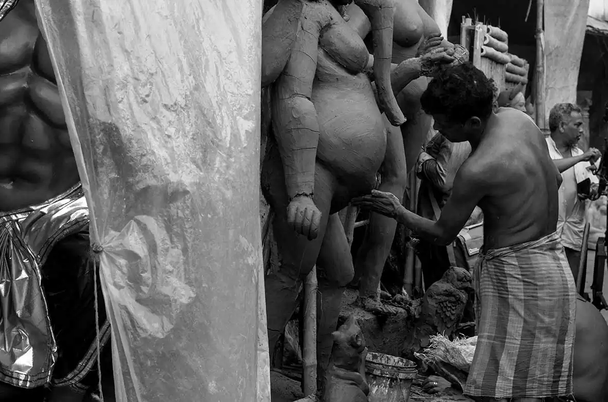The present day Durga Puja tradition goes back to the rich people’s quest to seek social prestige rather than to maintain the link to the common people. These days it is more glitz ,competitions, awards ,but rarely for the people behind the magnificent artwork and idols .The puja committees are competing with each other and resorting to all kinds of marketing gimmicks to be huge crowd pullers and win prizes for “themes” .Somewhere amidst all this ,we have lost the sanctity of the festival .The artisans are soon forgotten ,the moment the idols are taken to the “pandals” from their place of make. As a photographer who has spent an extensive amount of time in the place ,I can only express regret at the plight of the people. The making of a durga puja idol is an extensive process spanning across several months and stages .It requires careful planning ,meticulous work and perseverance on part of the artisan .What we see as masterpieces is the finished artwork ,often forgetting the intricacies and difficulties these people have to face .