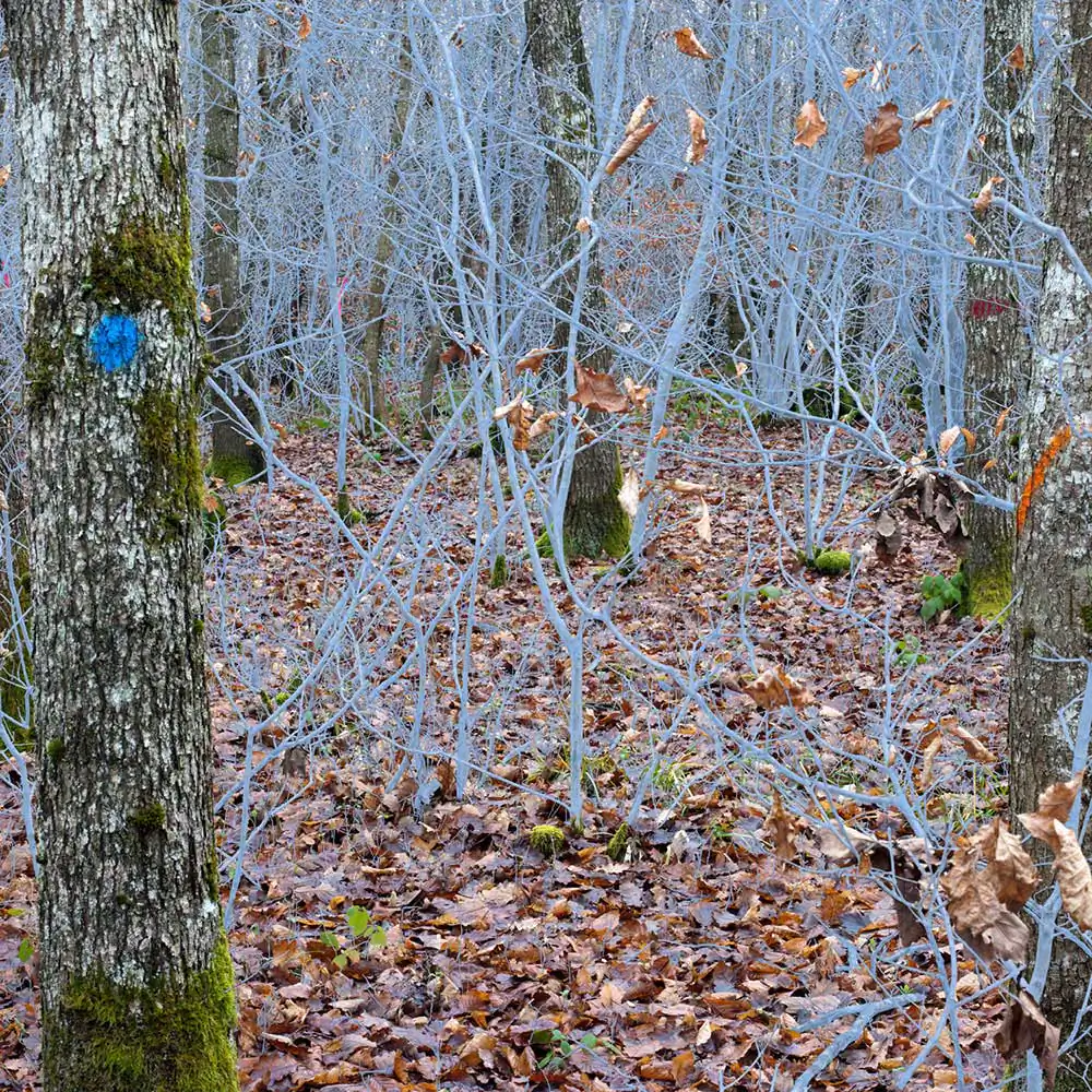 With Helen Sear’s Becoming Forest, the artist’s gesture of the hand is visible, where she has traced the lines of new forest growth. The chaos and entanglement of these hand drawn lines that follow the actual forest growth, contrasts with the geometric neon pigment marks spray- painted by the foresters. Sear reanimates the photograph, though the process of touch, and by referencing thedye used in medical imaging, to enhance what is barely visible to the human eye. This is a strongly grounded, and ongoing investigation of bringing the body back into the act of looking, rendering figure/body/environment as inseparable.