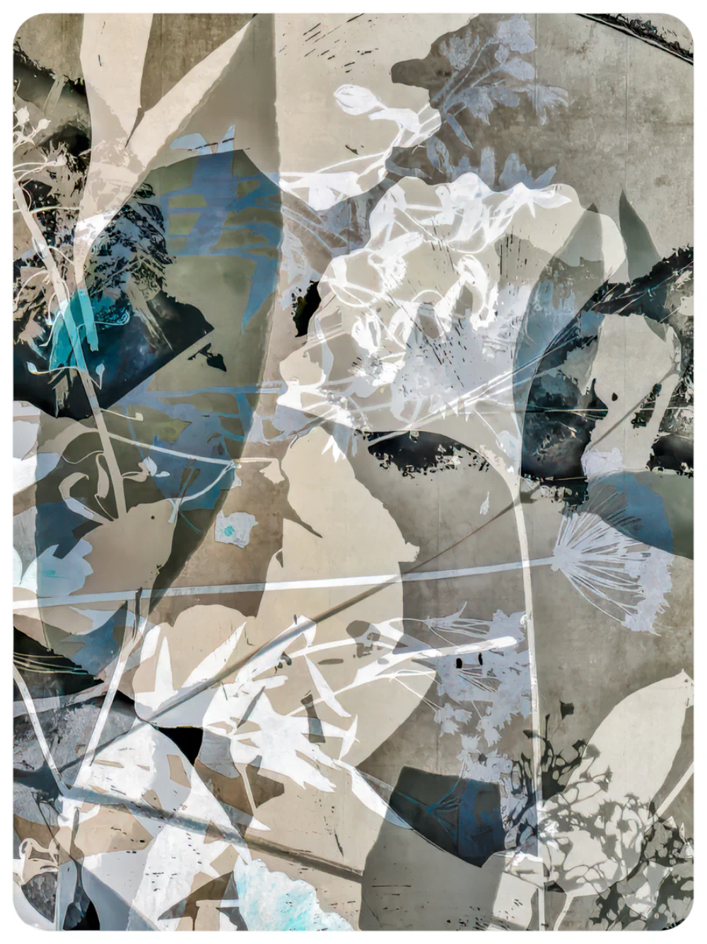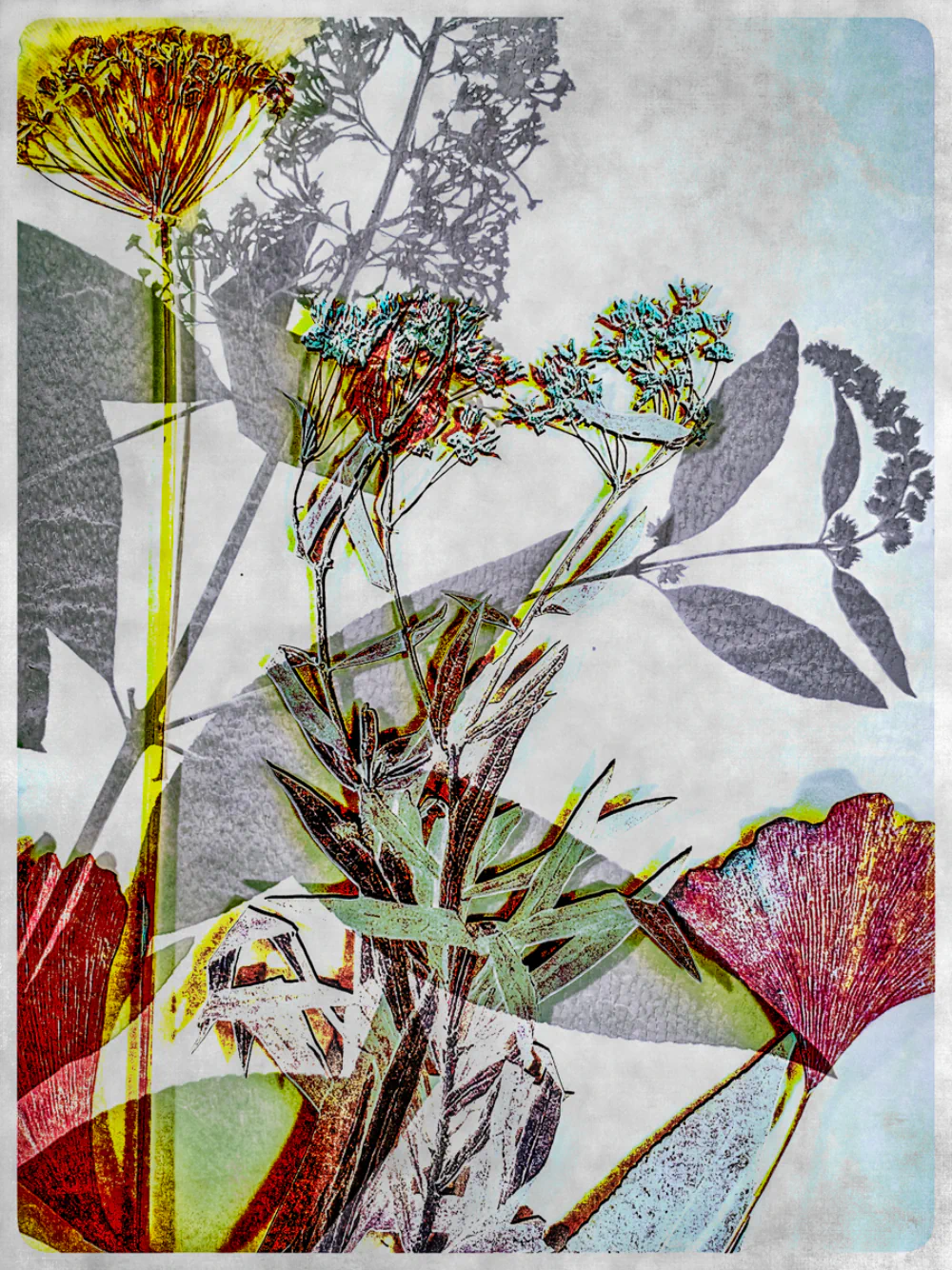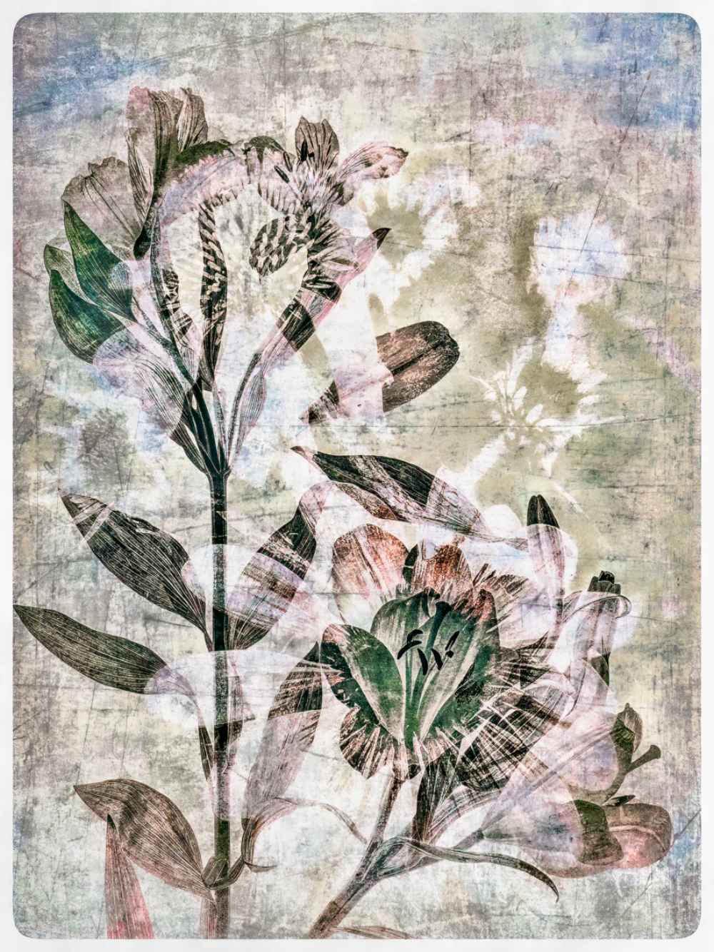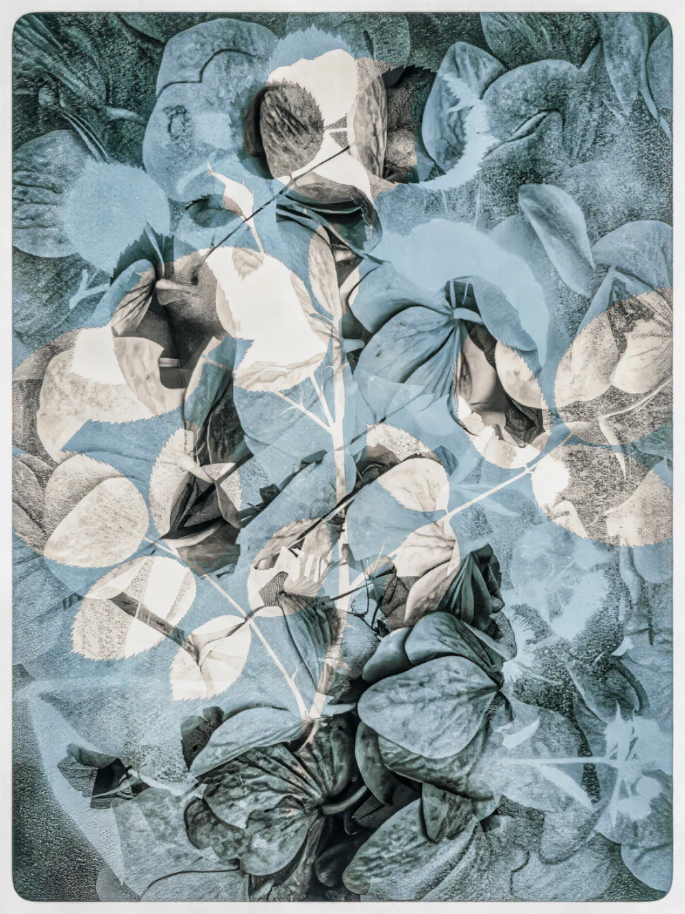 With this memorial project, she brings together her long-standing fascination with layers, abstraction, ambiguity, and the natural world. Working with floral material, she digitally fuses a selection of photographs from her archive—sometimes including cameraless, alternative process images she creates, such as cyanotypes, anthotypes, and lumen prints—and unites them into a composite image printed on paper or semi-translucent vellum.
