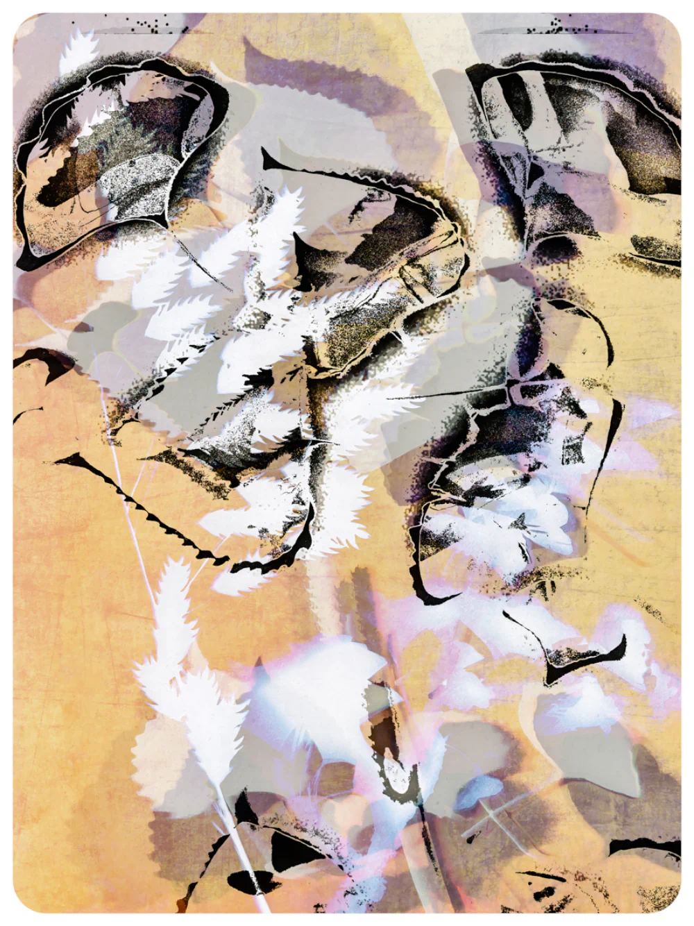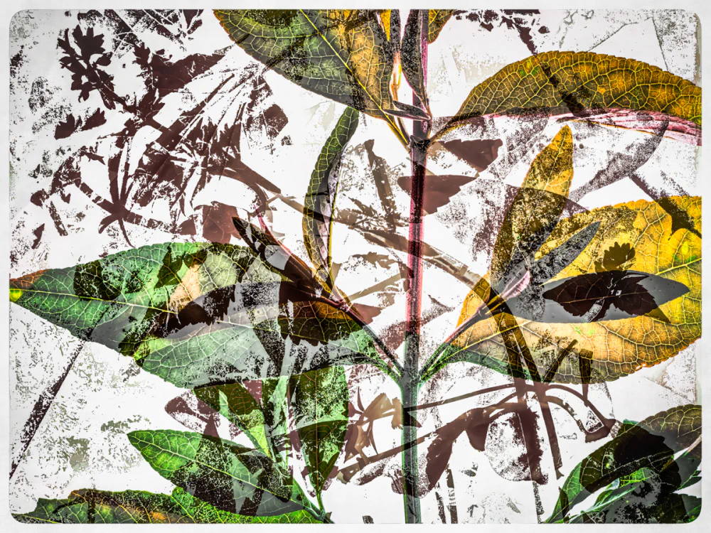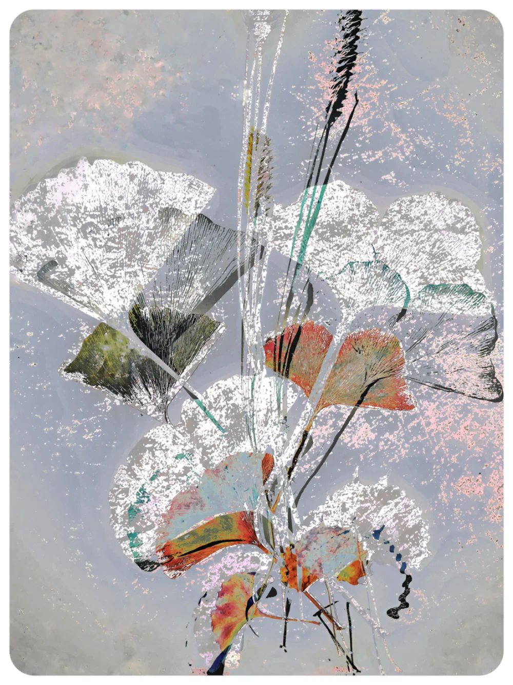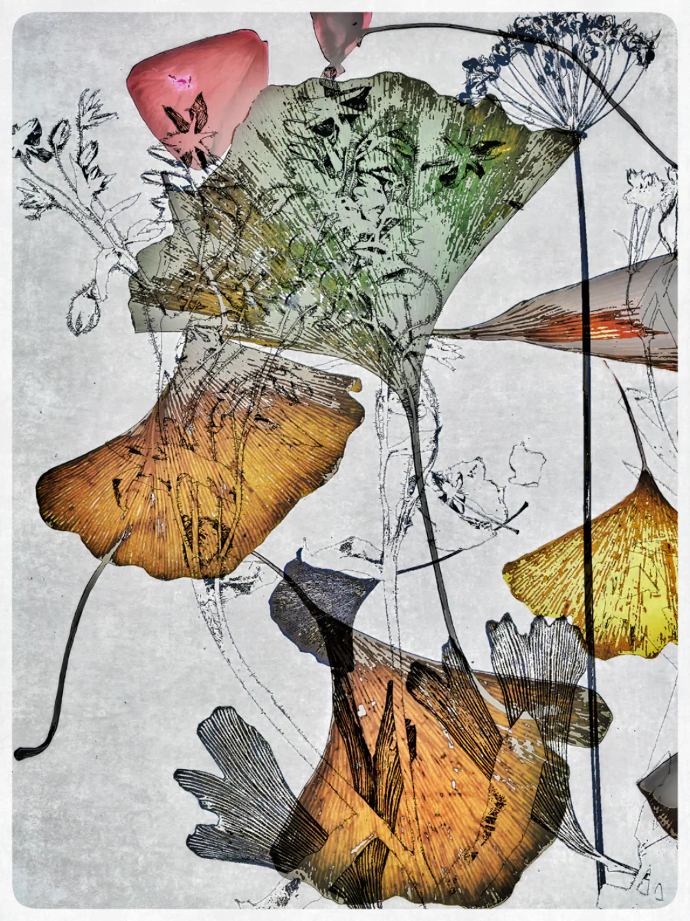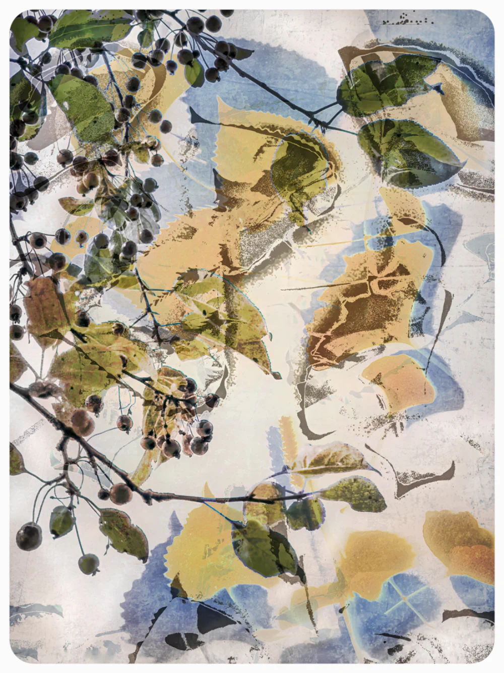 With this memorial project, she brings together her long-standing fascination with layers, abstraction, ambiguity, and the natural world. Working with floral material, she digitally fuses a selection of photographs from her archive—sometimes including cameraless, alternative process images she creates, such as cyanotypes, anthotypes, and lumen prints—and unites them into a composite image printed on paper or semi-translucent vellum.
