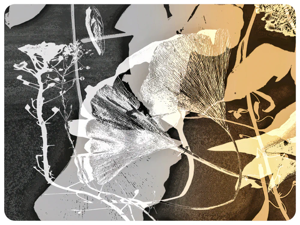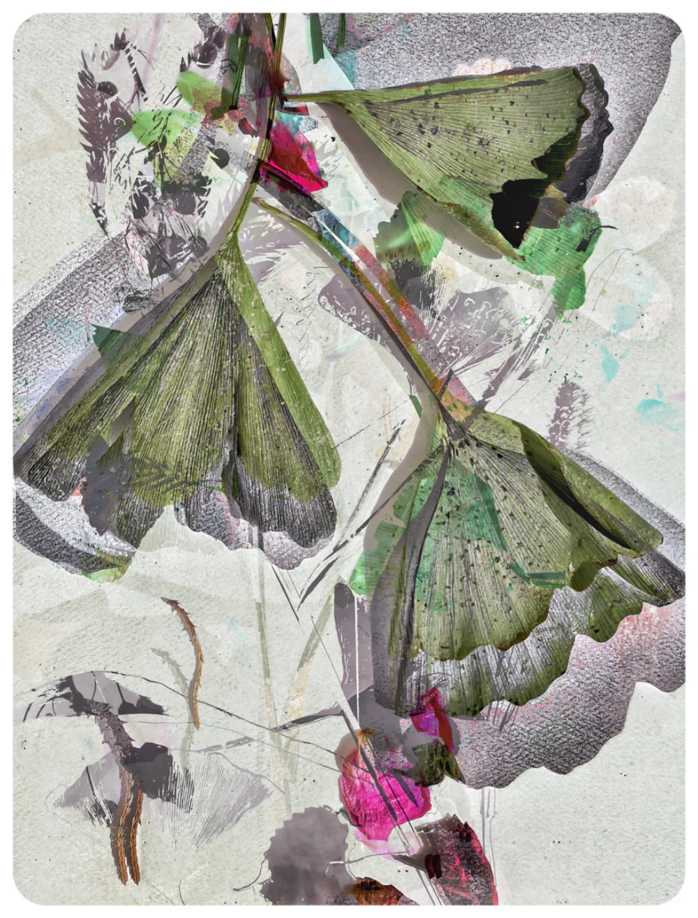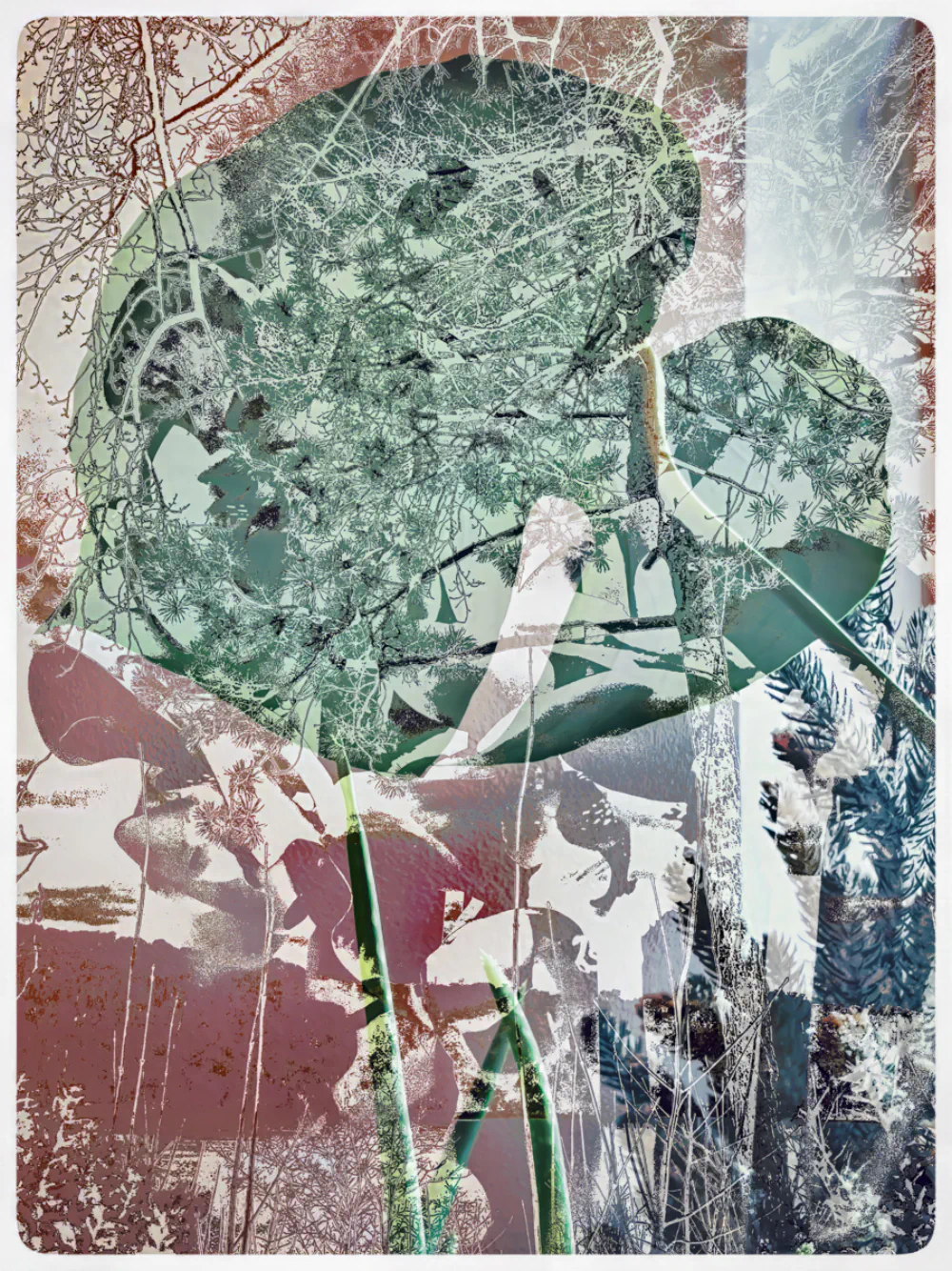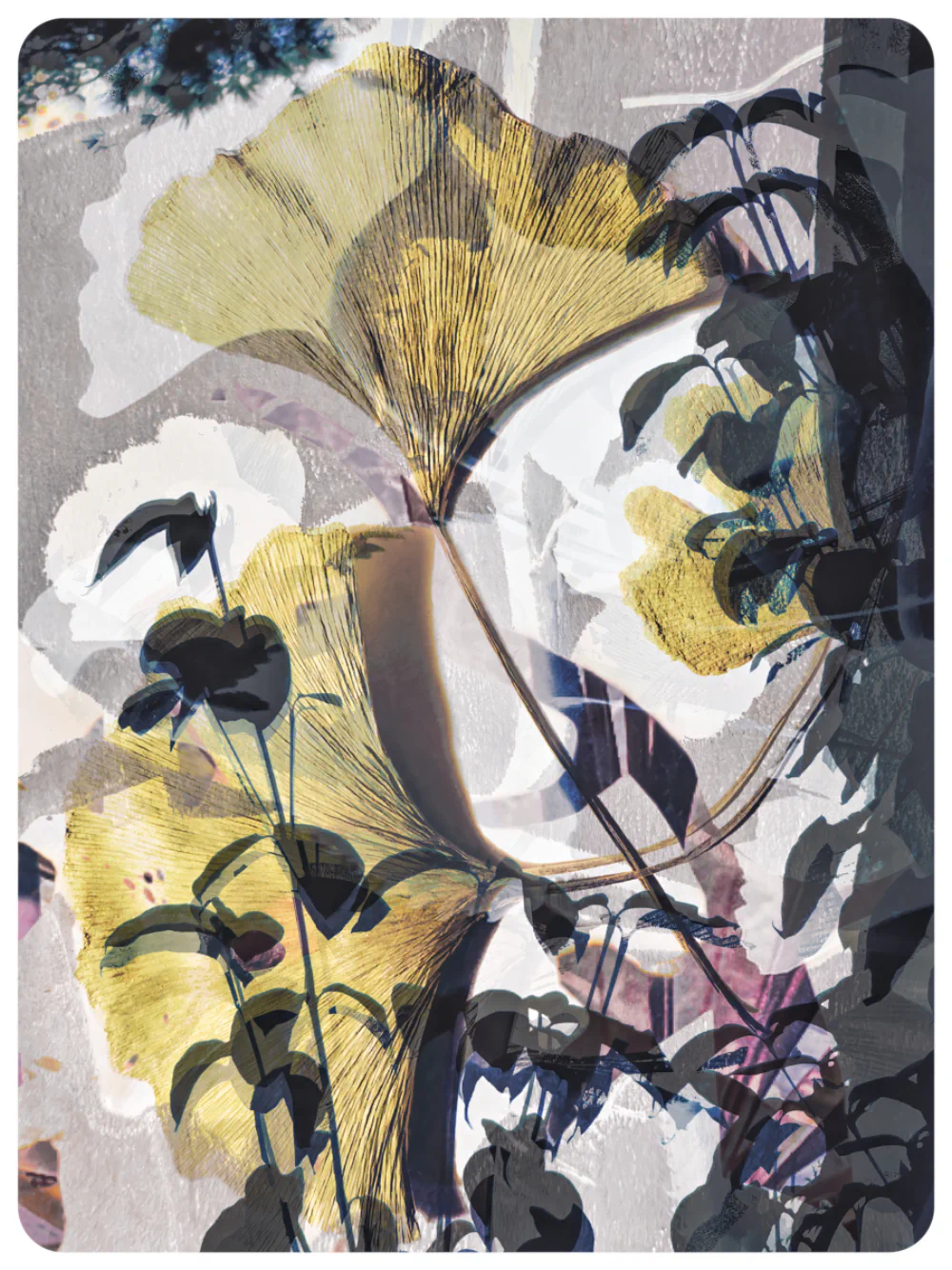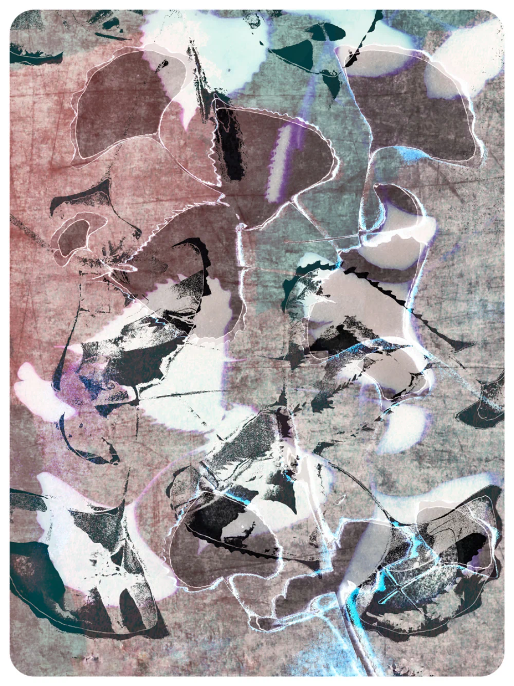 With this memorial project, she brings together her long-standing fascination with layers, abstraction, ambiguity, and the natural world. Working with floral material, she digitally fuses a selection of photographs from her archive—sometimes including cameraless, alternative process images she creates, such as cyanotypes, anthotypes, and lumen prints—and unites them into a composite image printed on paper or semi-translucent vellum.