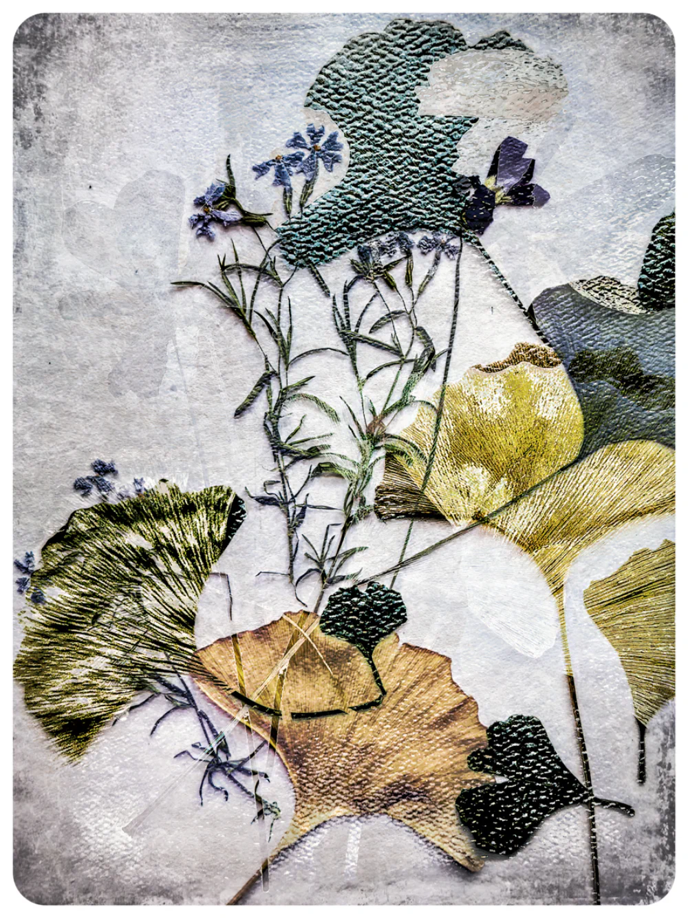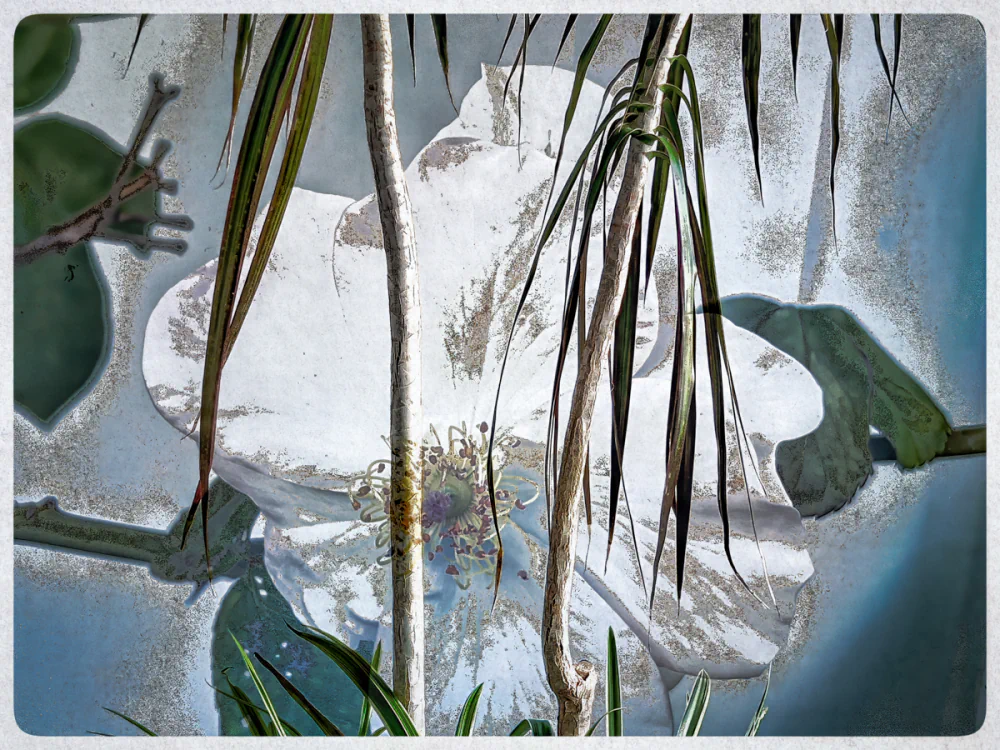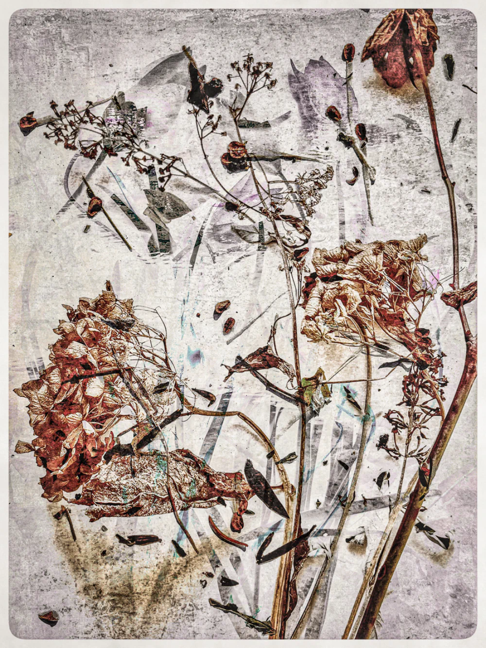 A year after her son’s death, she decided to honor him through her art-making. This project began spontaneously as she began photographing flora—mostly from her own garden—and experimenting to find the right elements to successfully combine into a single digital image.