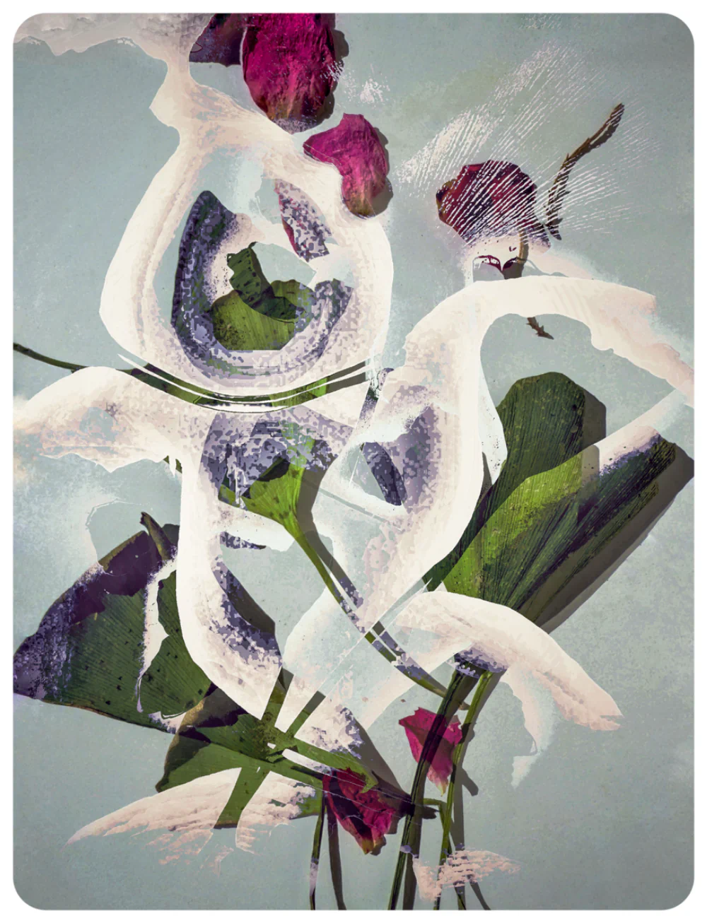 By naming each image after a departed individual, she honors them and offers comfort to their loved ones. Making this work—an exploration of memory, loss, and love—has been healing for her and is intended to help heal others. These are the flowers she was not able to send.