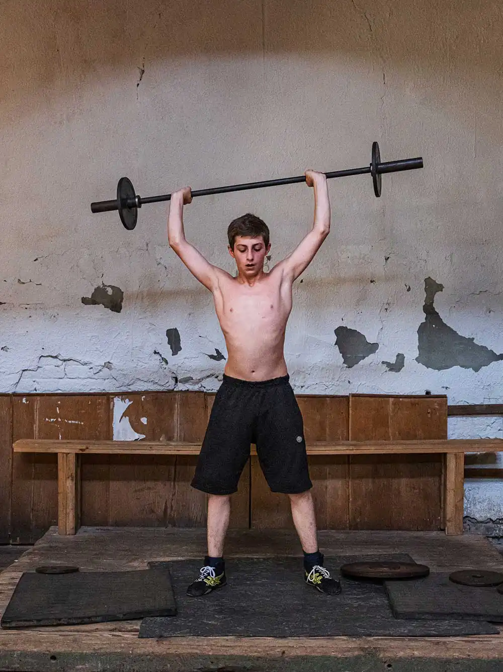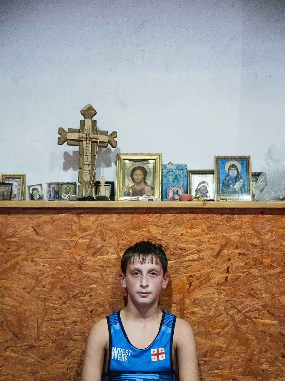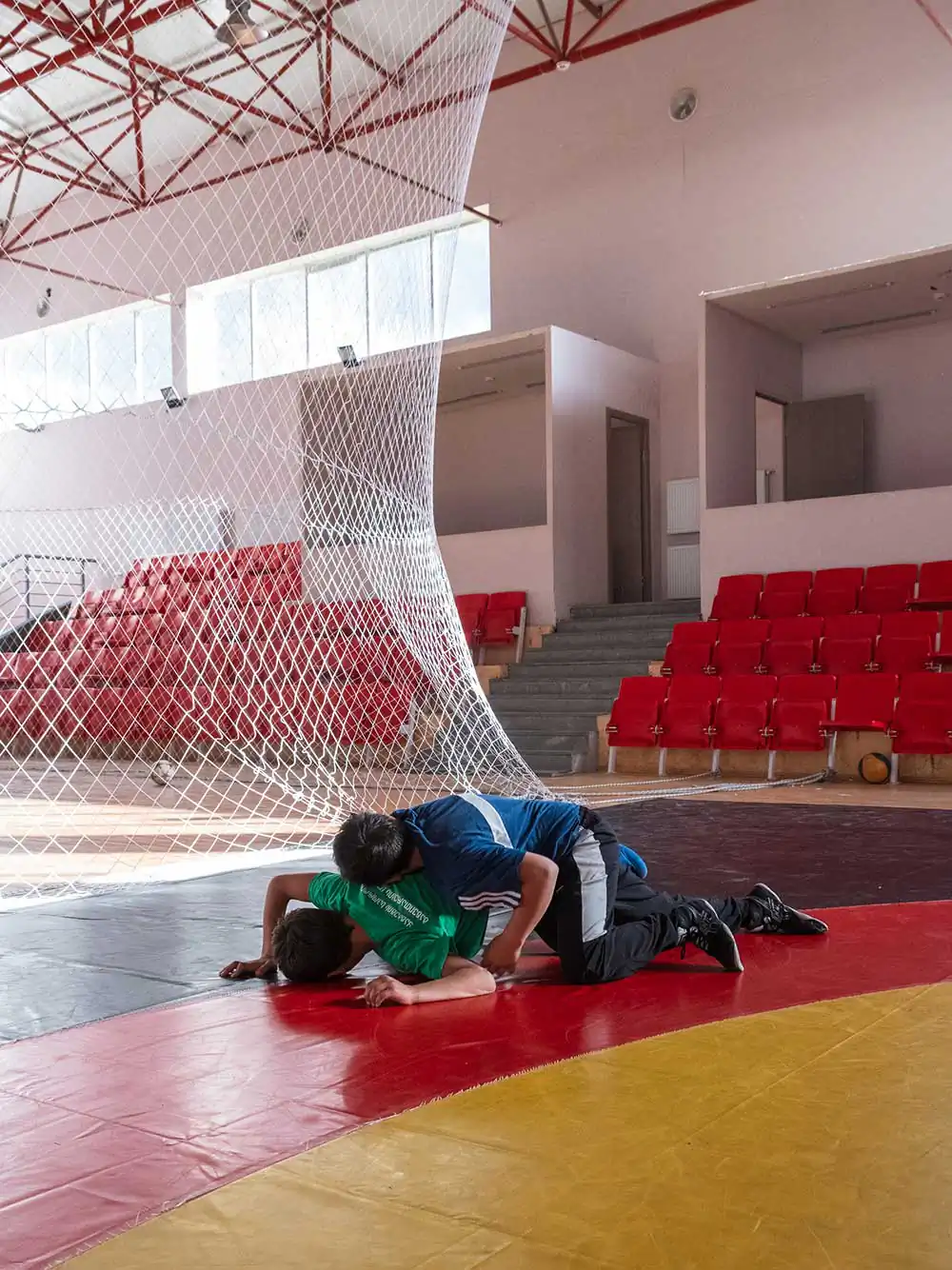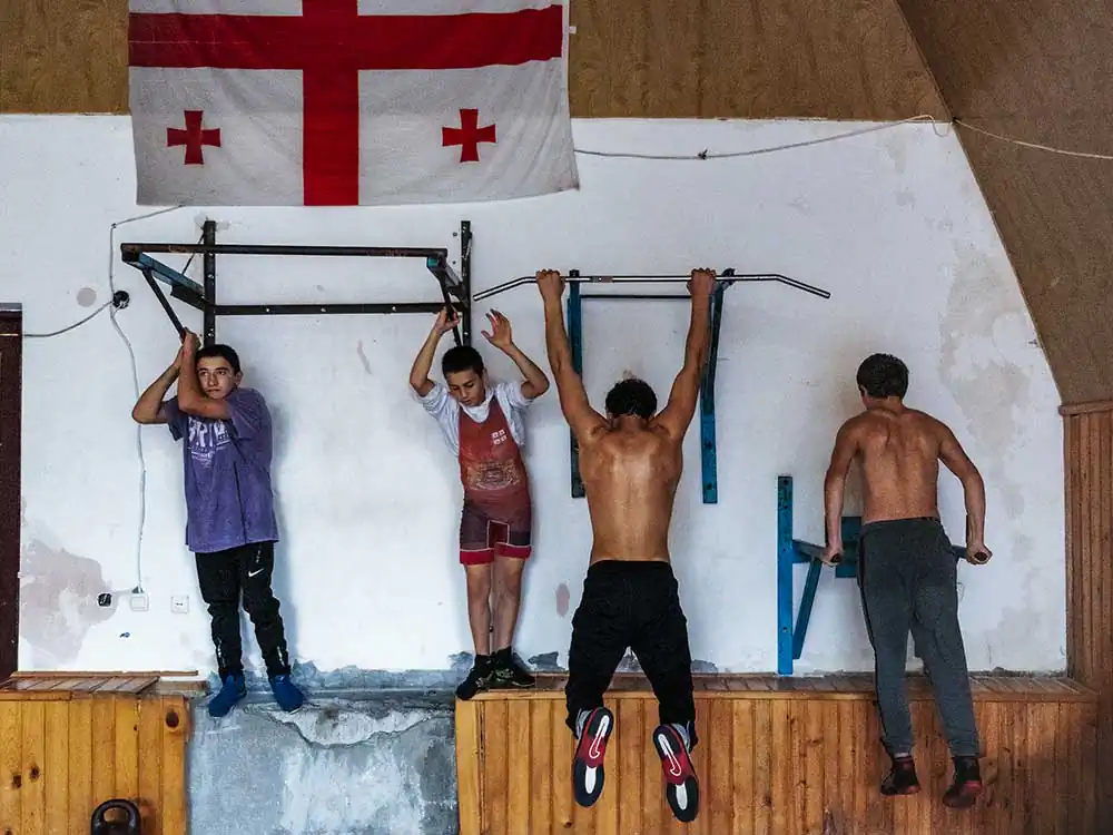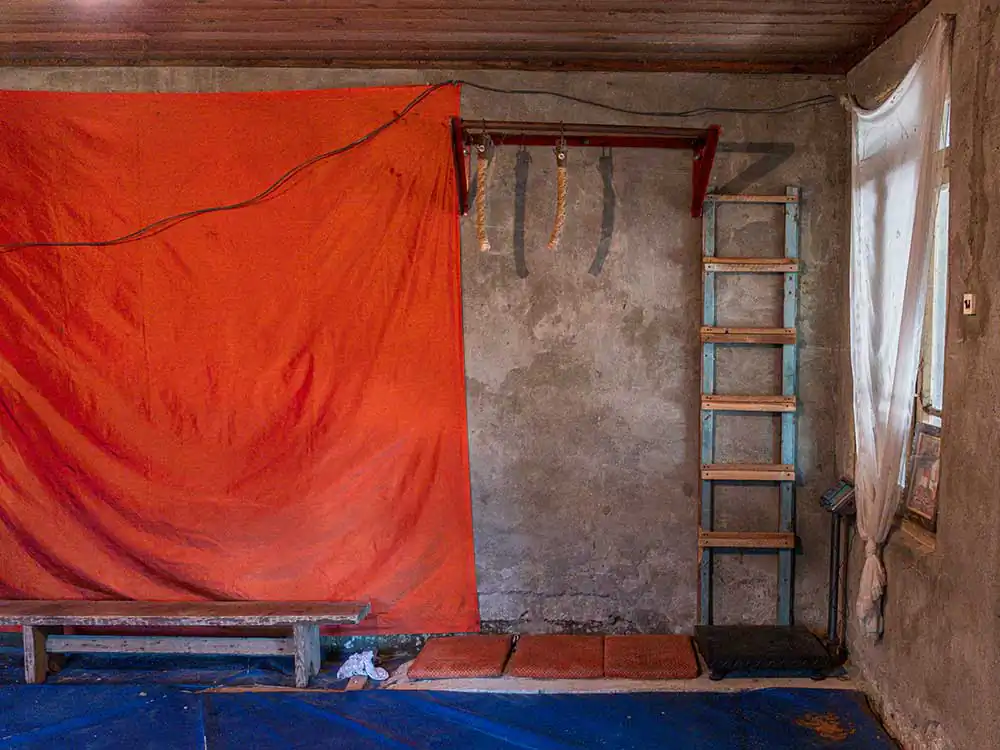 Georgia has a deep passion for this sport, and children are introduced to it at a very early age. Wrestling serves as a means of building strong character, a school of life that reinforces the model of a robust man. Each child learns to conform to social expectations, shaping his identity in the shadow of an omnipresent masculine figure. Set against post-Soviet environments that have suffered the ravages of time, the images explore historical, cultural, and religious resonances, creating a palpable link between the past and the future in a country still marked by political tensions as it seeks independence. In these deteriorated surroundings, every crack and every peeling wall stands as a silent witness to the struggles and dreams forged within them.