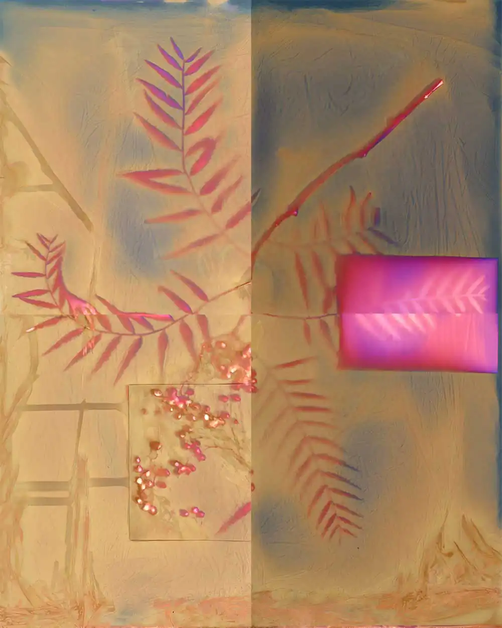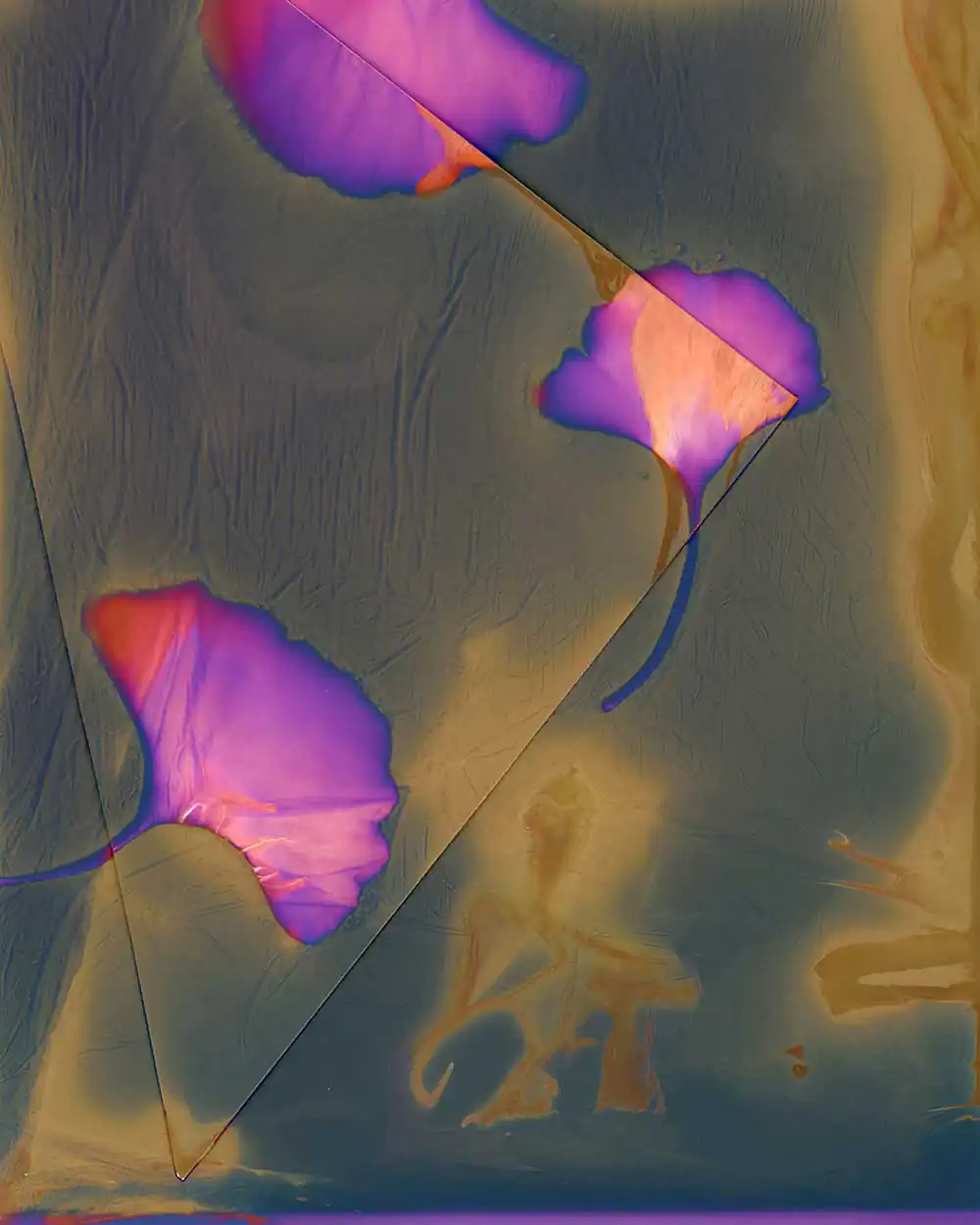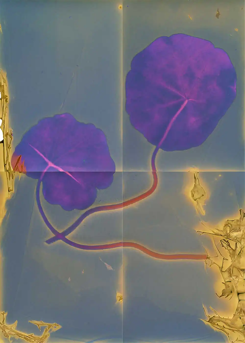 With the latter, my thoughts shifted from acquisition of craft to learning a language. In my Lumen prints, instead of ink, I used various biological materials to form bold strokes and elegant lines or whispers of dots and dashes. The imaginary square was transformed into rectangles or other shapes defining the space. The written language is both a means of communication and the art form that is calligraphy. Just as the defining characteristics of the calligrapher’s hand suggests a personality, so too each paper I use reveals a different latent color as if speaking to the personality of the paper. My project, “Learning Mandarin and the Language of Lumens,” is about learning a process that harkens back to photography’s beginnings, influenced by the visual poetry and rhythmic grace of an old writing system.