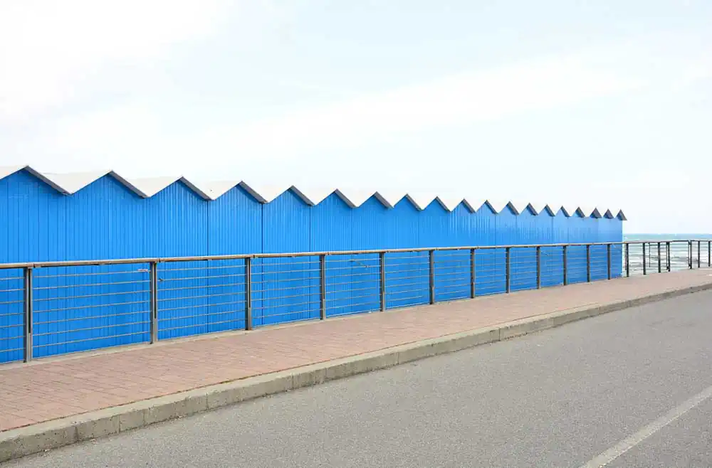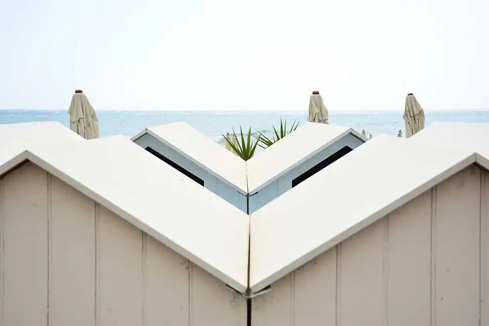 These shots, for example, can tell of the geometry and rigor of the beach cabins, which enter into a perfect color palette with the sky and the sea. Often you can put together diptychs that refer to each other with colors, shapes, and lines. The beaches are separated from the promenade by barriers that become slender protections, inviting to be crossed more than deterring the curiosity of those who observe.