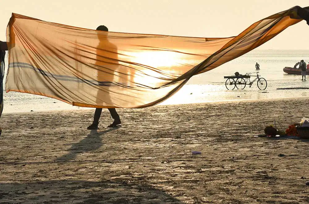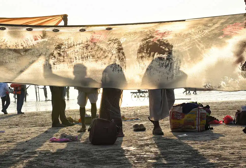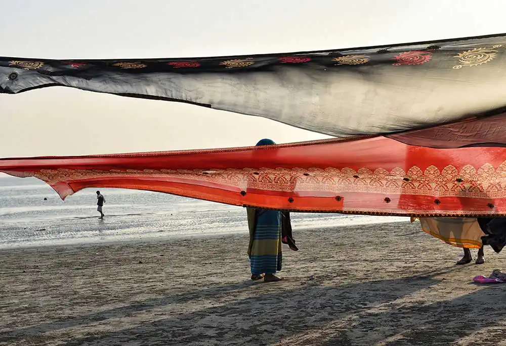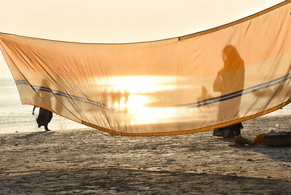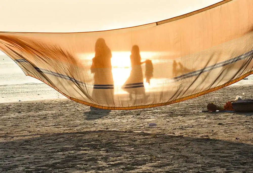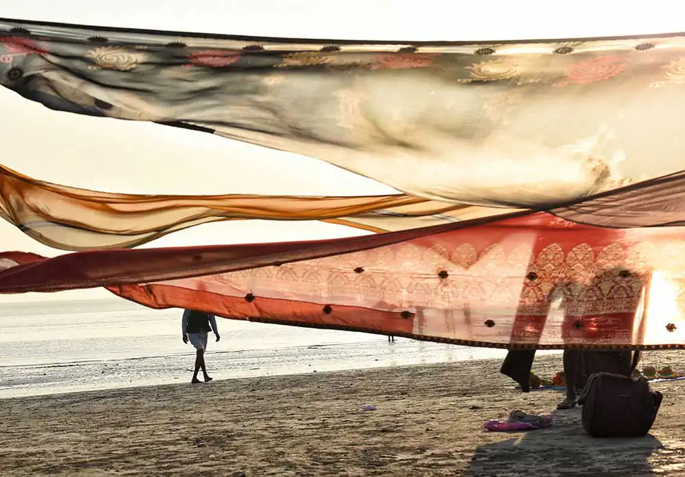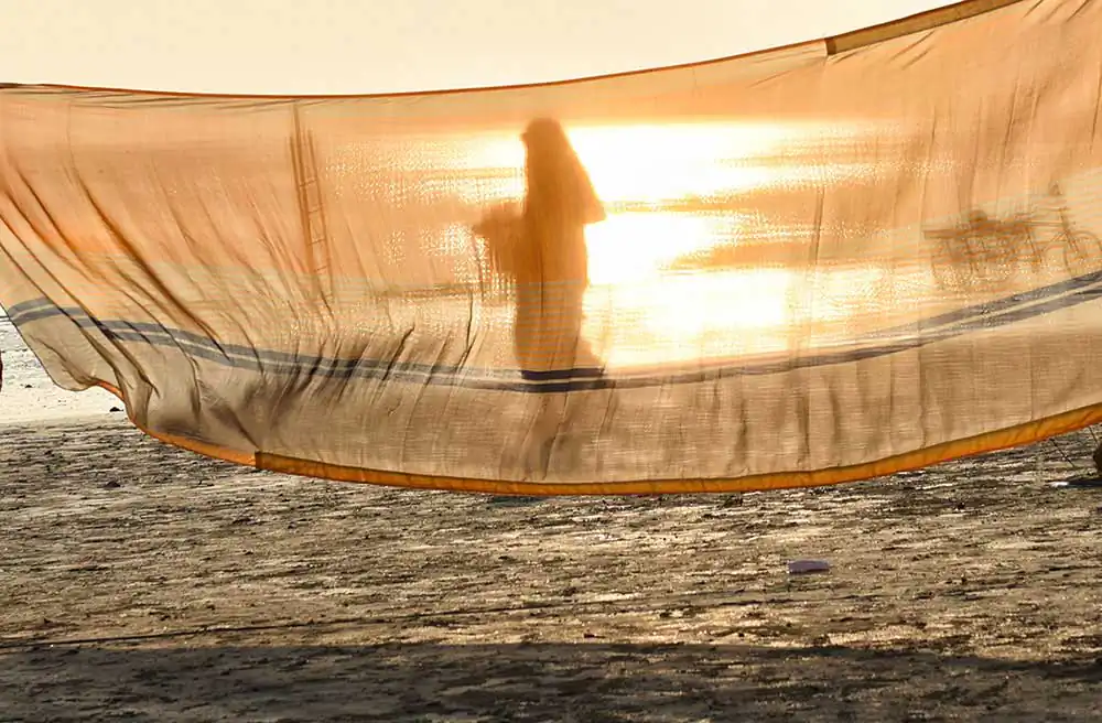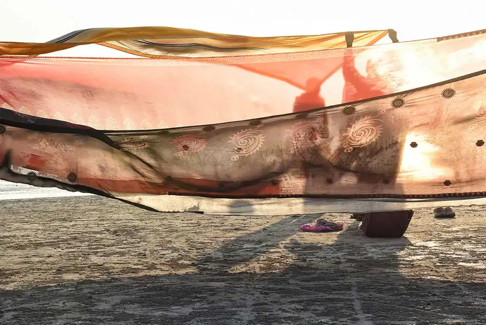 I frequently visited Ganga-sagar, a religious place at the confluence of River Ganga and Bay of Bengal. A temple of Kapil Muni is the main attraction to visit there. People normally come here to pay homage at the temple after bathing at Ganga -sager. After bathing pilgrimage normally dry their wet clothes in the open space on the river bank in the morning time. An abstract feeling came to my mind by seeing their drying clothes apart from their religious activities. I was attracted by the colours of transparent clothes, the light passing through the clothes, and the people and their shadows in motion behind the drying clothes.