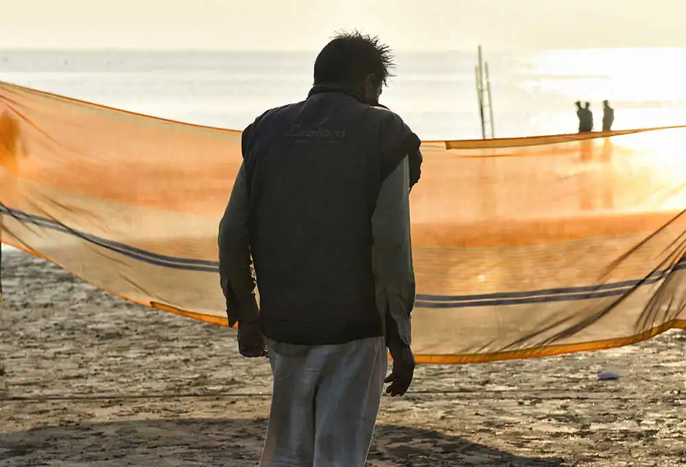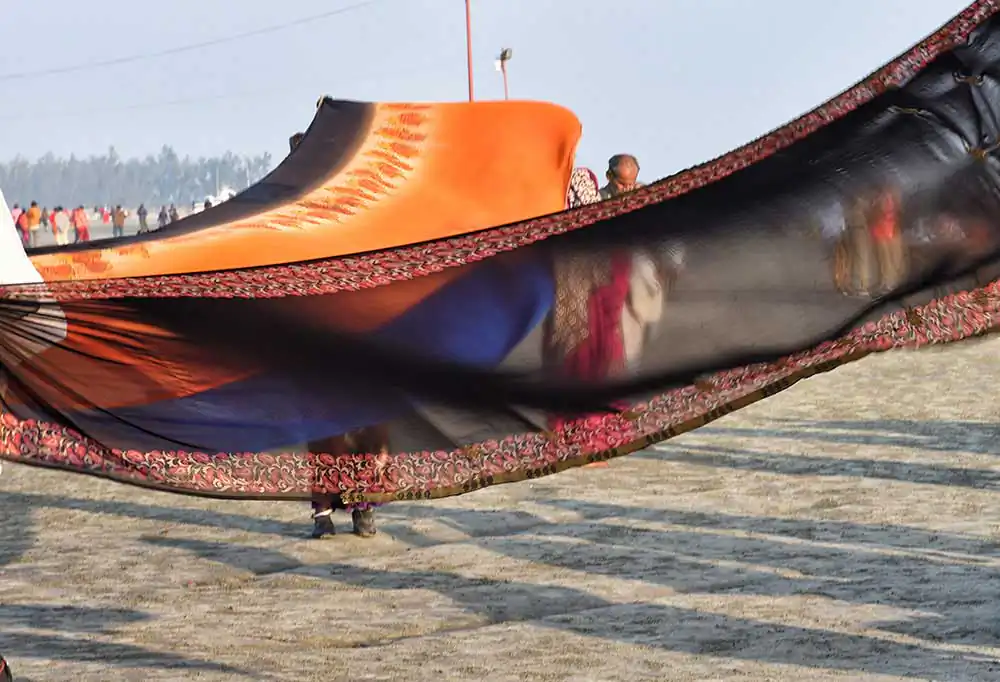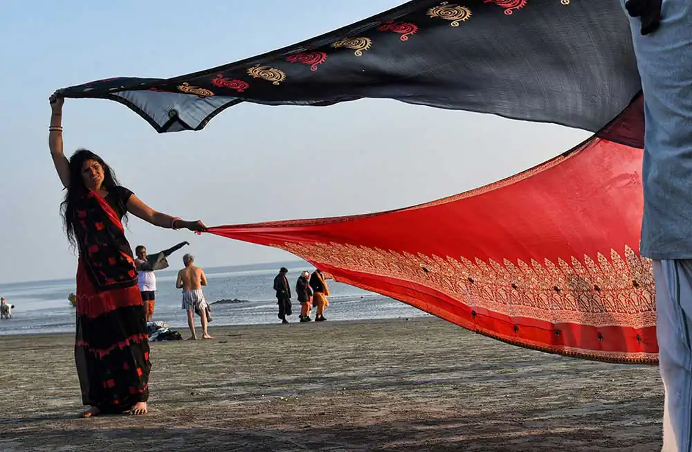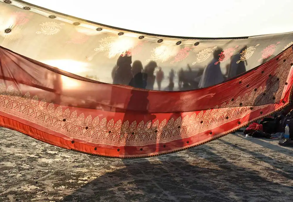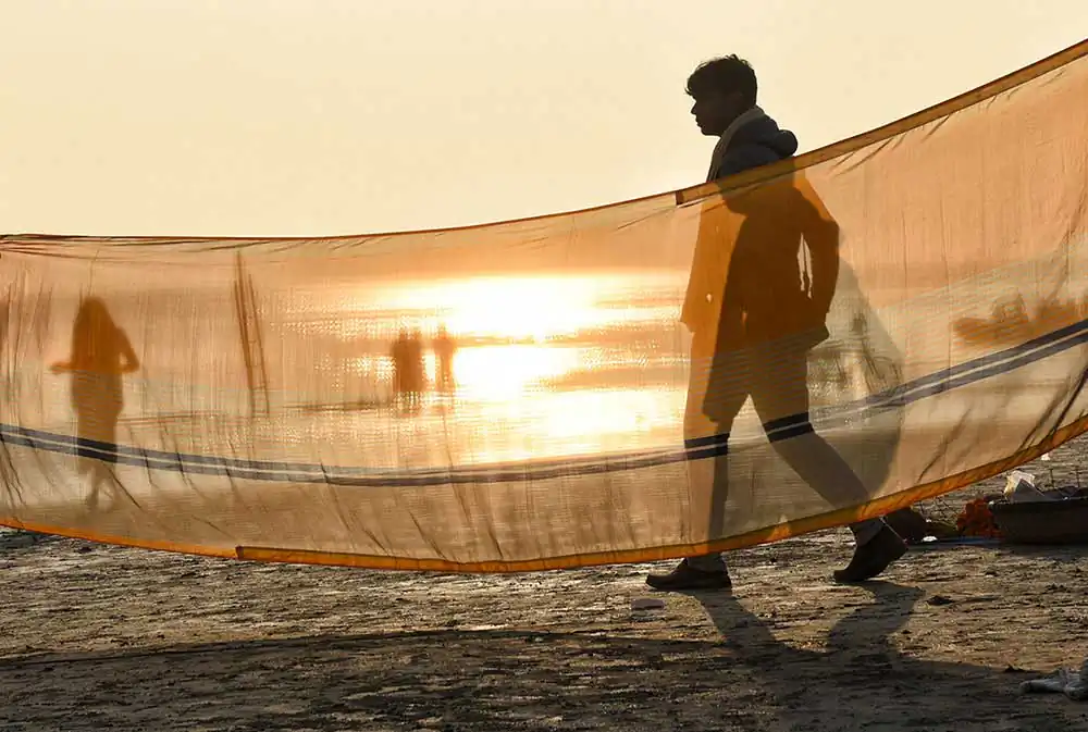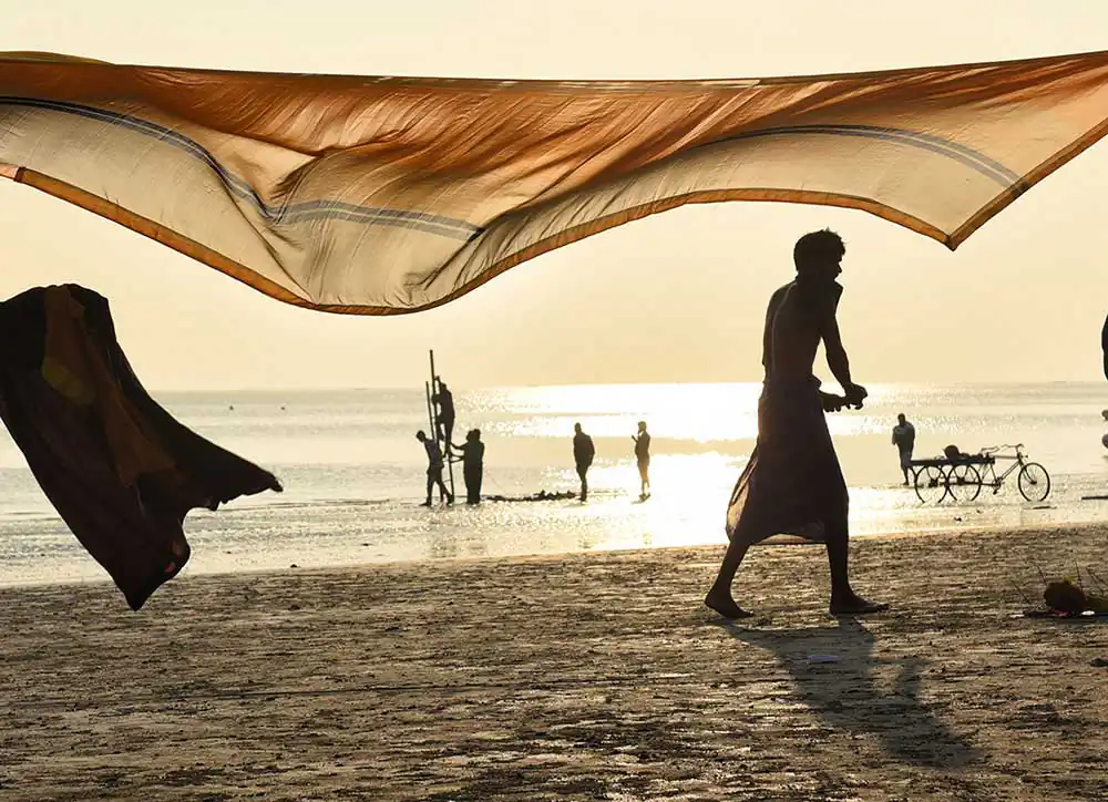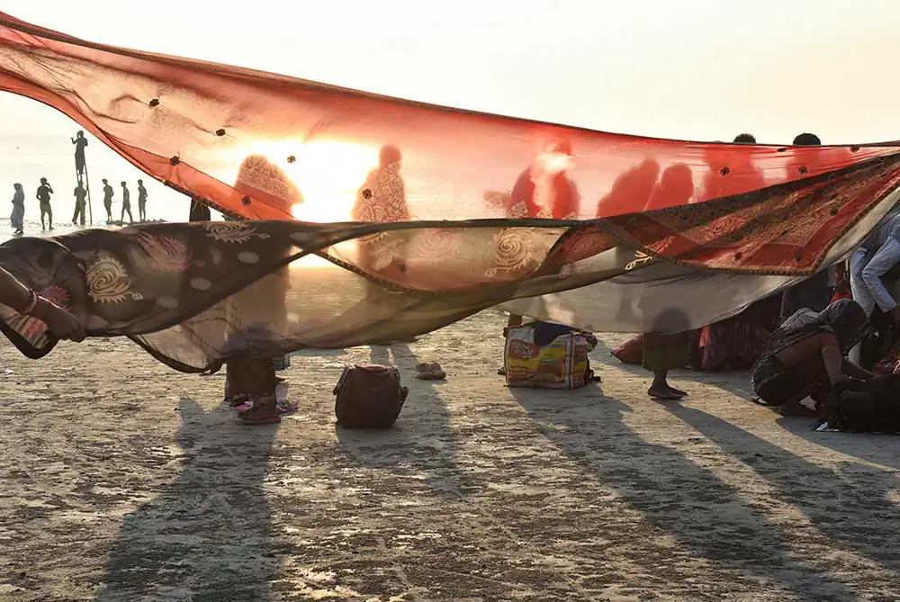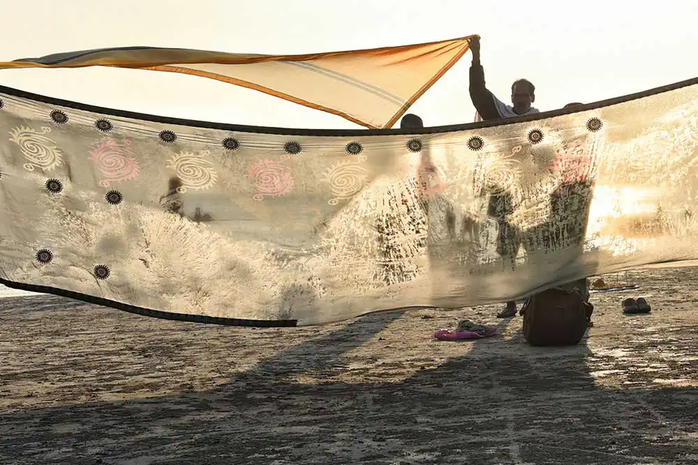 I frequently visited Ganga-sagar, a religious place at the confluence of River Ganga and Bay of Bengal. A temple of Kapil Muni is the main attraction to visit there. People normally come here to pay homage at the temple after bathing at Ganga -sager. After bathing pilgrimage normally dry their wet clothes in the open space on the river bank in the morning time. An abstract feeling came to my mind by seeing their drying clothes apart from their religious activities. I was attracted by the colours of transparent clothes, the light passing through the clothes, and the people and their shadows in motion behind the drying clothes.