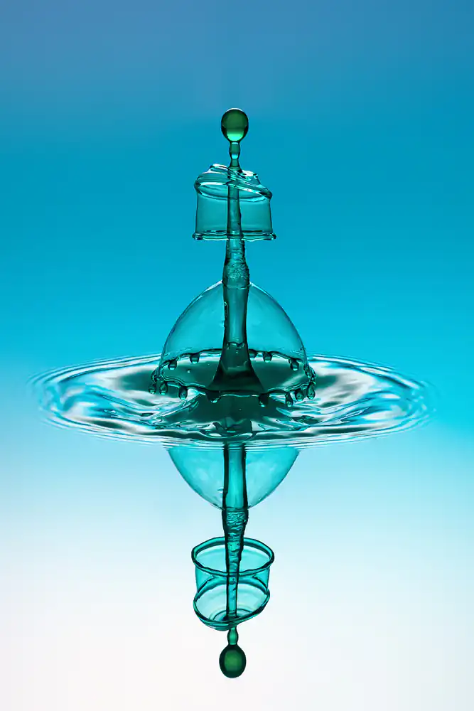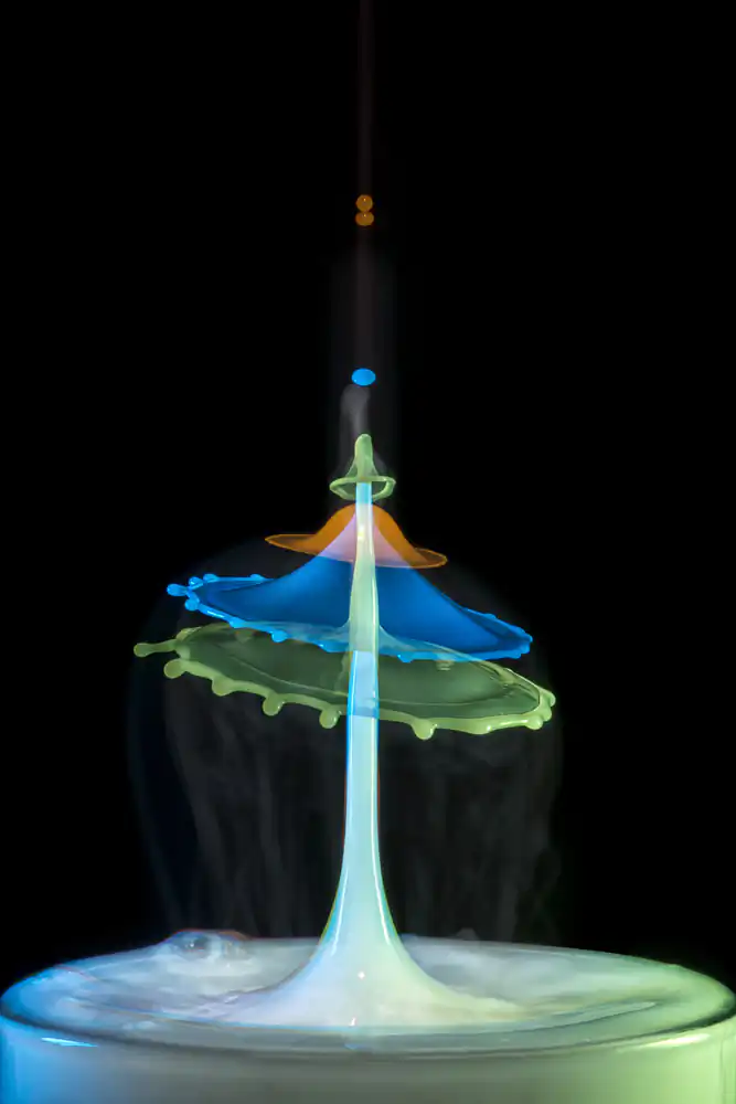 The Basic “Drop on Drop” technique works with 2 drops. The First drop fall into the Water and formed a crater, then a crown and finally the Pillar. The second drop must be timed that he land on the Pillar and with the collision he formed the shapes like. Mushrooms, hats or flying disc.When the distance between the first and the second drop gets bigger, the shapes goes into flying disc. When the Distance gets lower, the shape turns more into hats. The middle Drop speed is about 10 drops per second (here are the Mushrooms) . With 15 drops per second comes the flying shapes and with 6 drops per second the hats.