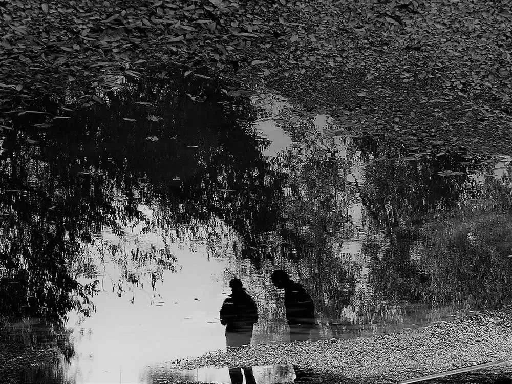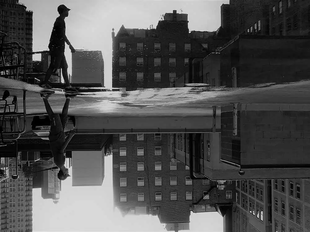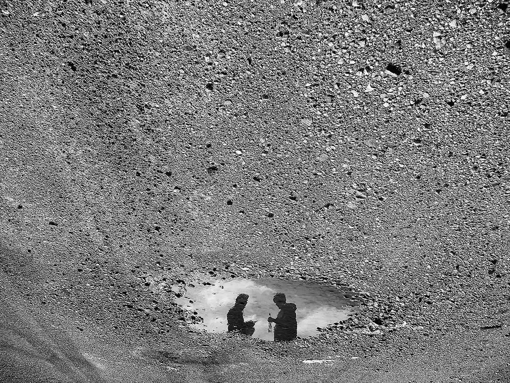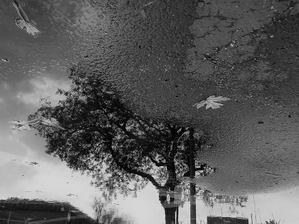 This seeded an idea. Why not study these specific anomalies: “Liquid Mirrors,” in other words, water puddles, and their beauty in their abruptness, and disruptive clarity contrasting the murkiness around us. The man-made vertical mirror gives us a 180 degrees view, but, the liquid mirror on the horizontal plane, a disruptive phenomenon, caused by the still rain water in superficial depressions, heightens views 360 degrees horizontally, and 180 degrees parabolically, fanning up from zero to one-hundred-eighty degrees at the other end. All one has to do is walk around looking into it for a myriad of perspectives. This is not accounting for the various angles you can shoot for, by bending, squatting and moving your sideways for visuals that would make one dizzy.