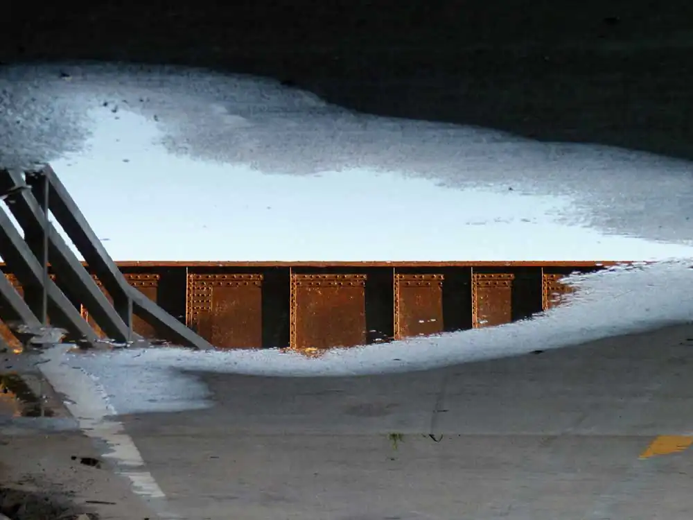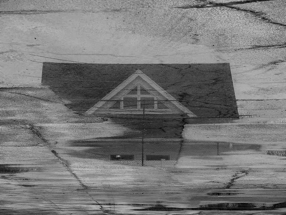 There are two laws of specular reflection (mirror). The first is that the angle of incidence and the angle of reflection are equal; and the second is that the incident and reflected rays and the normal to the surface are in the same plane.” If I carried over this observation and applied it to our liquid mirrors – then, several things would become manifest… or would they? The water puddle is also a kinetic object, a container of sorts with an uneven bottom, (now oil would be different) which reacts to breeze, and vibrations of heavy equipment near it. Several complications emerge if we apply the laws of specular reflection to our liquid mirrors. First: would the angle of incidence and reflection be equal, given the “Chanced” flat surface atop with an uneven bottom? Second: would the light rays diffuse if the water surface is kinetic? Third: what happens when the puddle is clear and shallow versus dark or opaque (dirty) water?