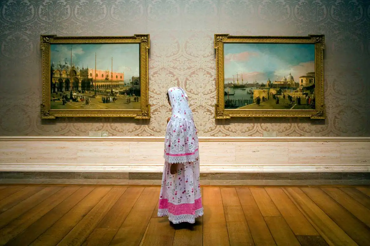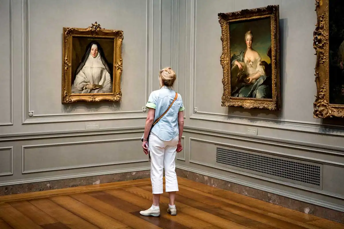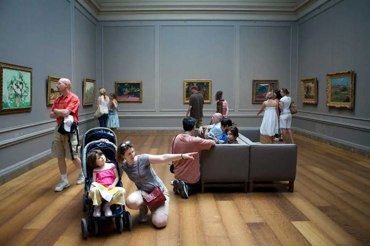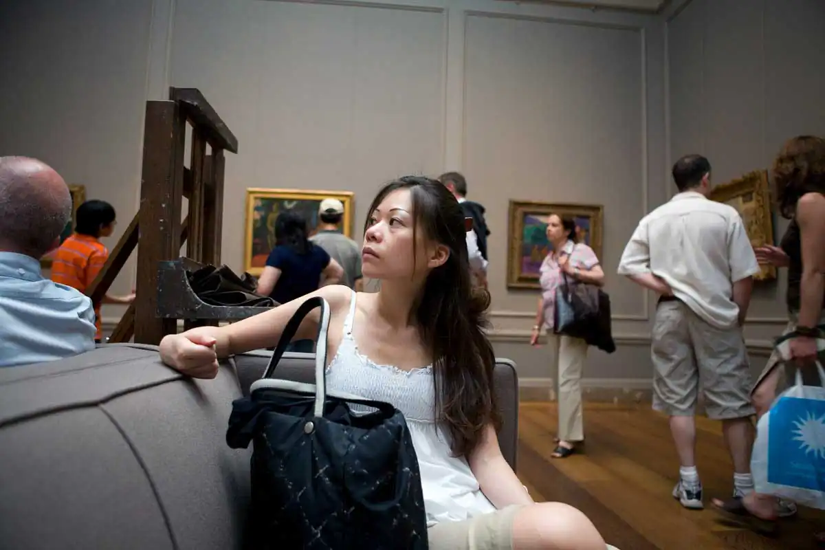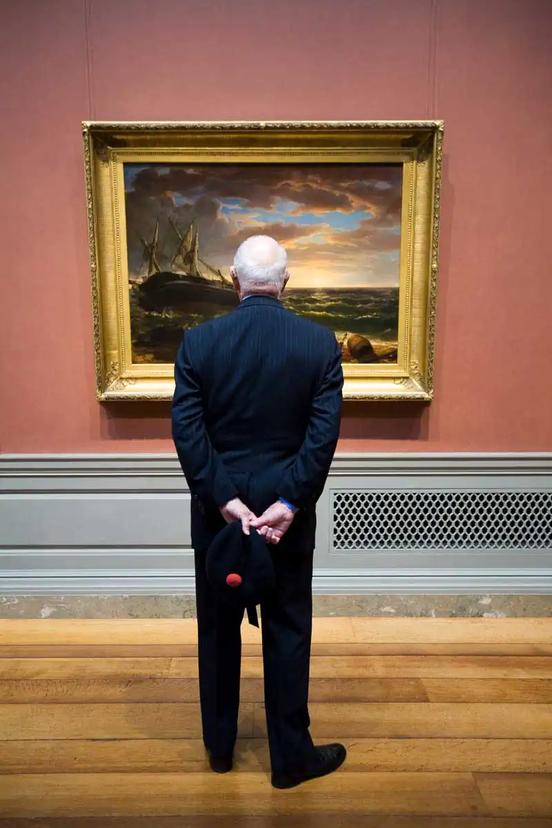 A museum is the quintessential milieu in which to observe this element of human existence. In the simplest terms, a museum exists to collect, to preserve and to present objects for visitors to look at and experience. The audience is limited to just looking and there is a certain etiquette in looking — not too close and definitely no touching. This perpetuates an often-humorous dance of the viewer around the artwork.
