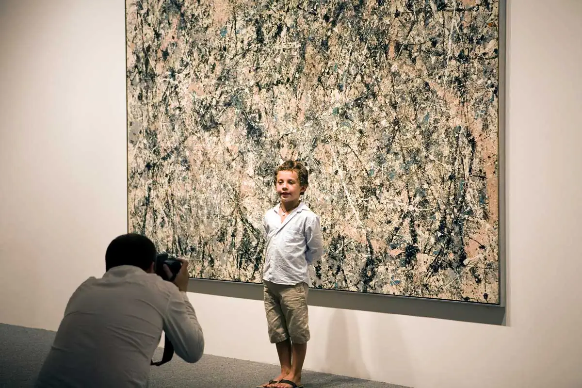 Hirshfeld also plays with the idea that art is a commodity up for consumption. Just looking is sometimes not enough for these museum-goers. They often relate to the artwork by photographing it themselves. In plate #30, a father snaps a photo of his son in front of a Pollock painting seemingly not even getting the whole painting in the camera frame but rather creating an abstract background in which to frame his son. What is the father’s intent? Does photographing the art make it more accessible? Is it proof of having been there and seen it? Does the photo of the artwork represent the real thing? Or is it less about the artwork and more about obtaining and remembering the moment, the moment of being there, the moment of looking?